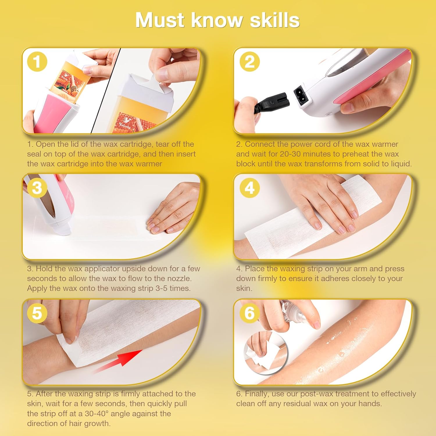 ✅ [Note] Conduct a temperature and skin test before depilation to avoid scalding and adverse reactions. Roll on wax kit package included 2 * Wax Cartridges, 1 * Wax Warmer, 50 * Wax Strips, 1 * After-wax Treatment, 1 * User’s Manual.