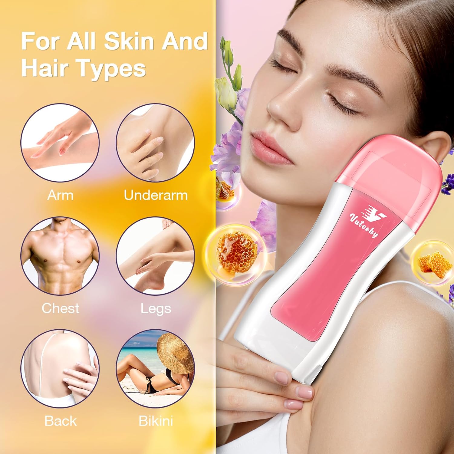 Roll on Wax Kit, Waxing Kit for Women and Men, Wax Roller Waxing Kit for All Skin Types, Roll on Waxing Kit for Hair Removal, with 2 Soft Honey Wax Cartridges and 50 Pcs Wax Strips