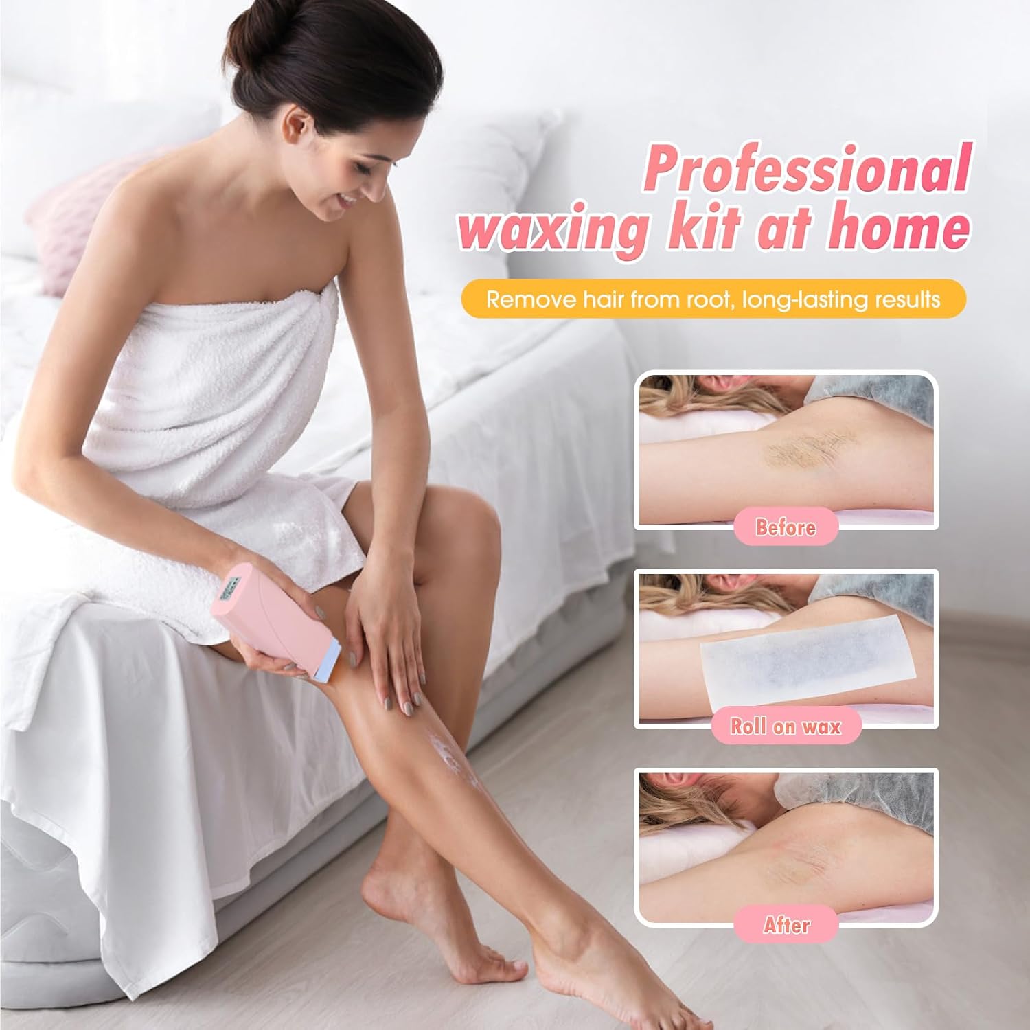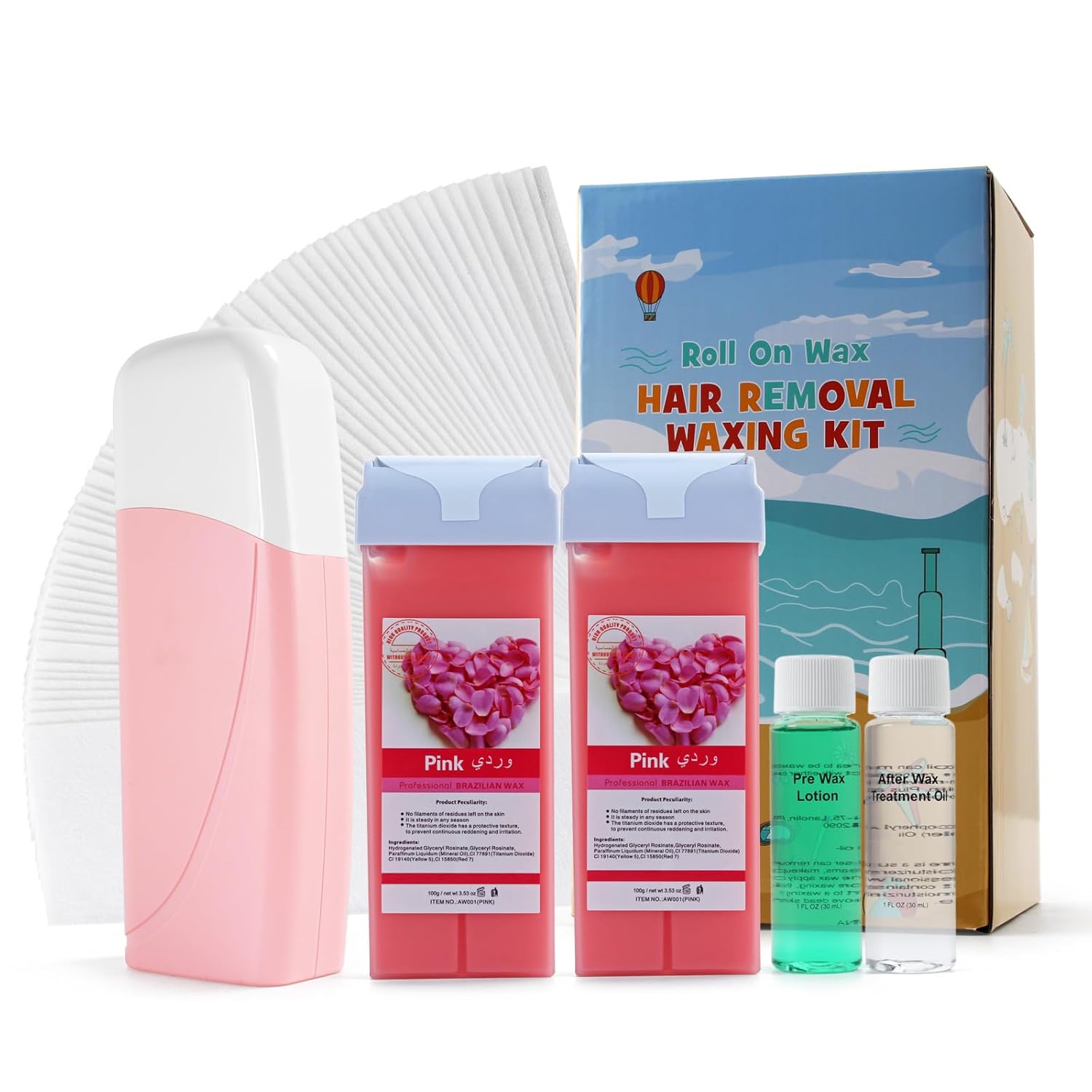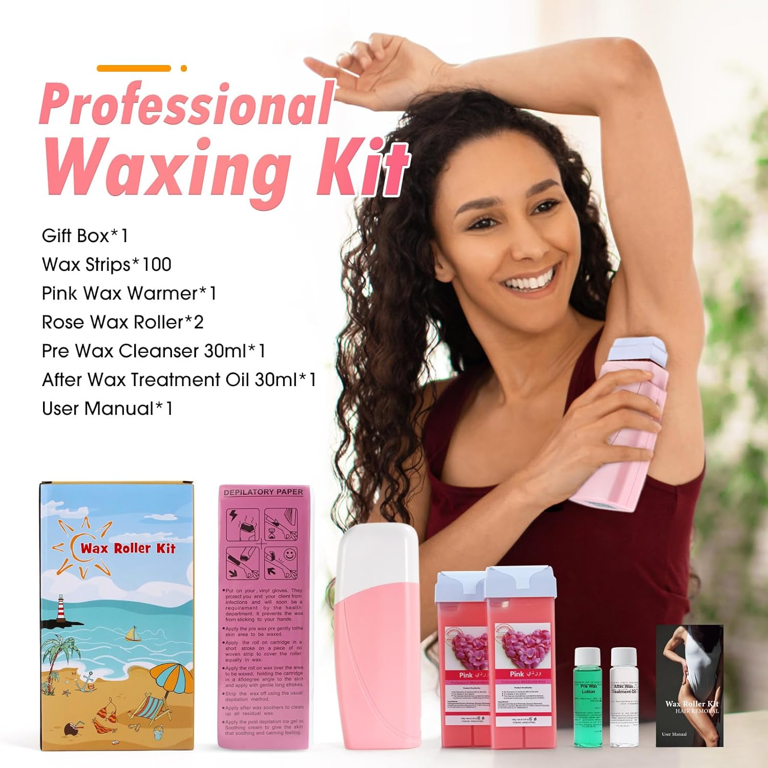 Waxing Kit for Women Men: The waxing kit includes a 40W pink portable wax warmer for hair removal, 2 rose roll on wax refills, 100 large non-woven wax strips, 2 bottles of wax treatment oil. Ideal hair removal waxing kit products for women and men.