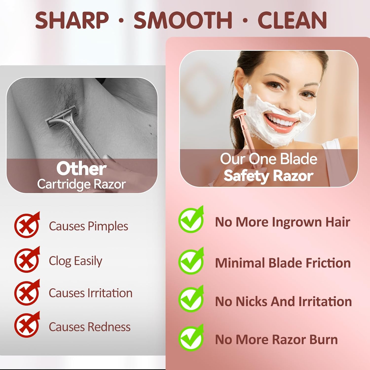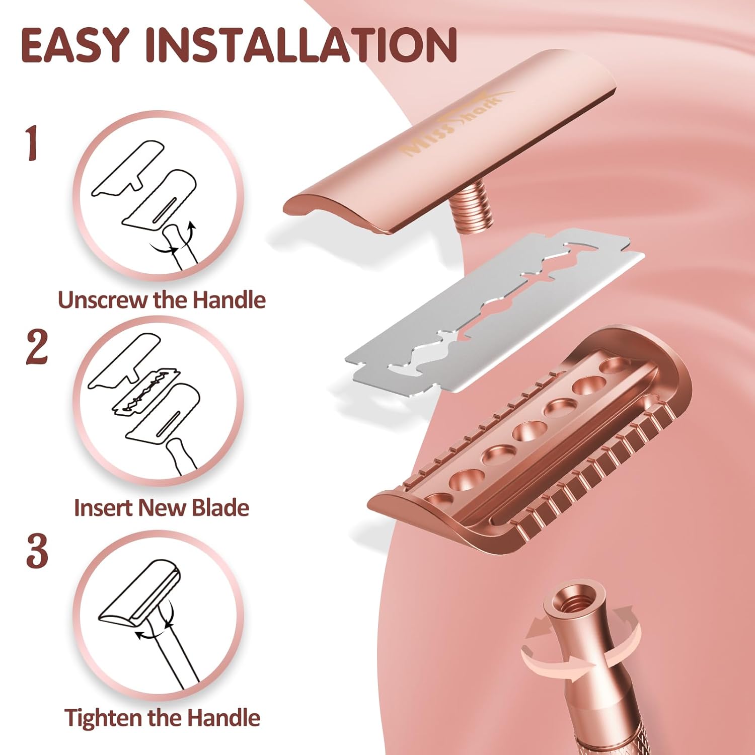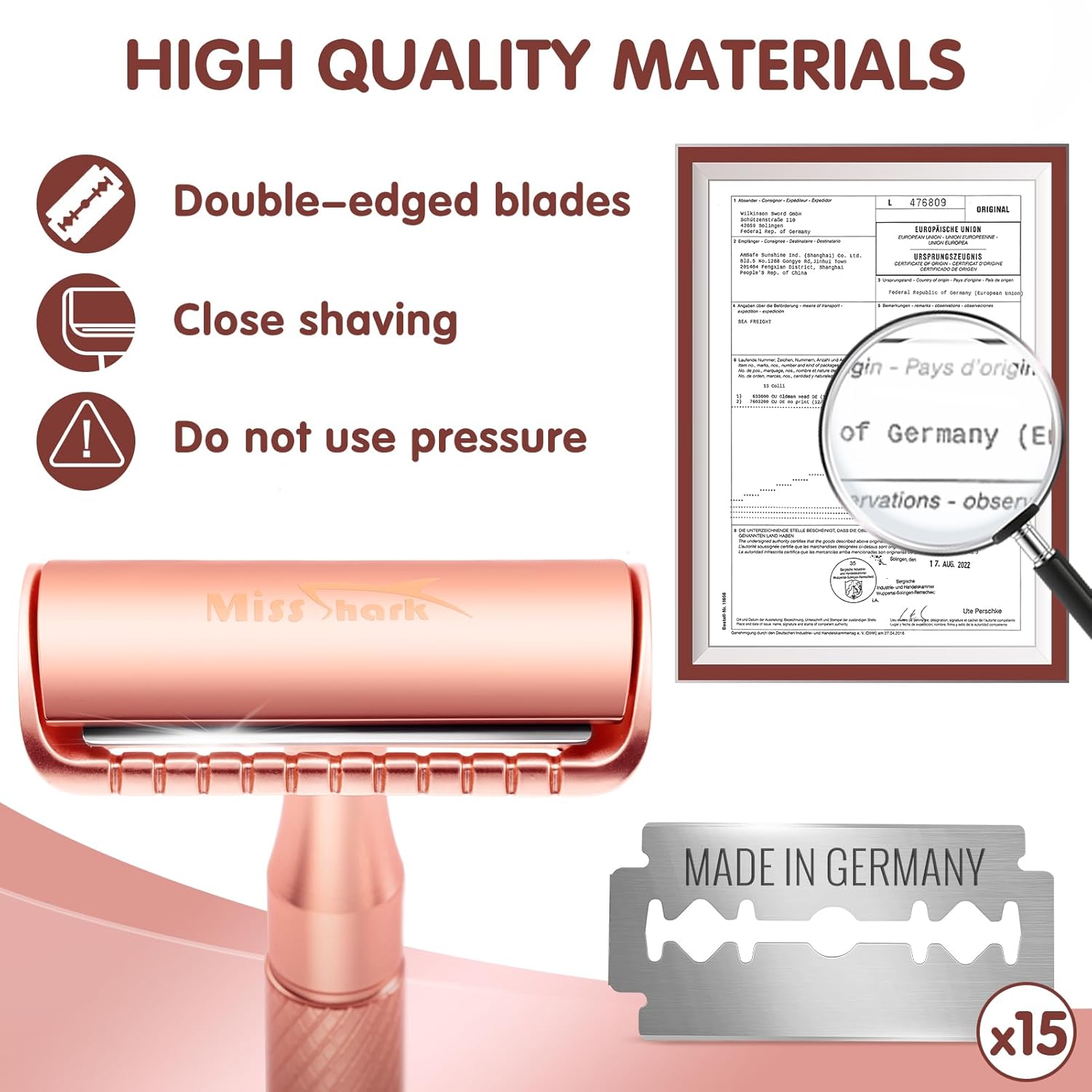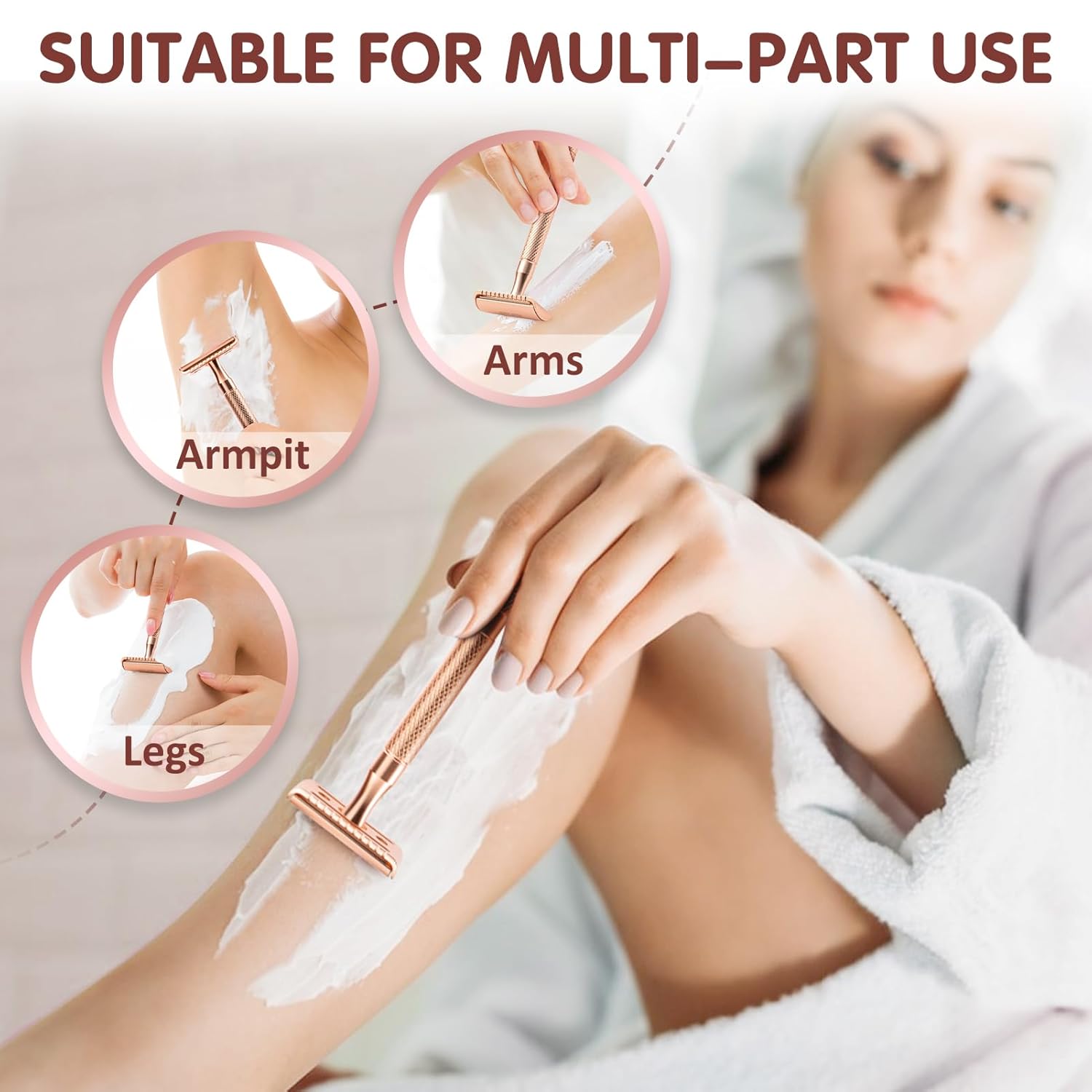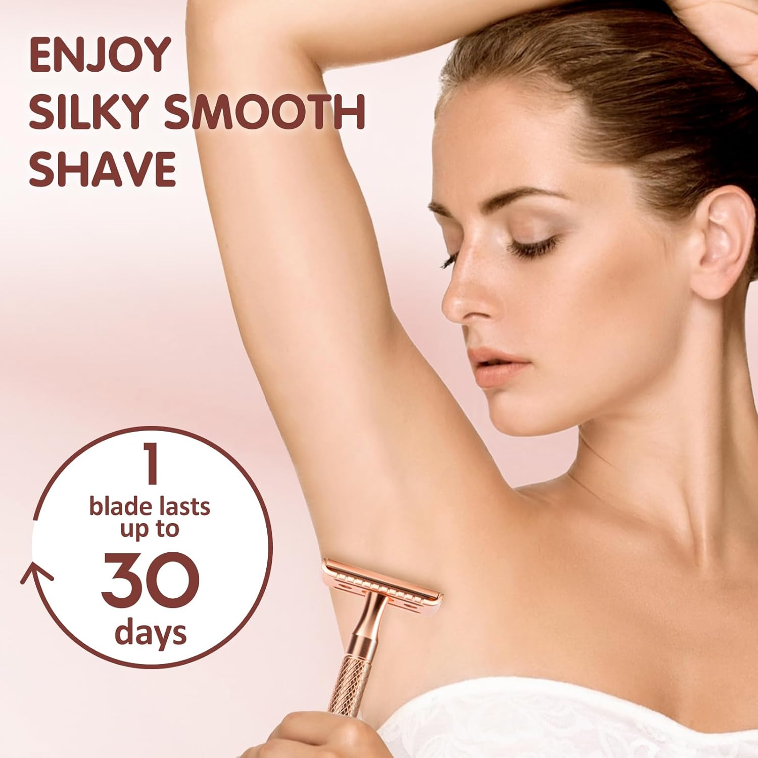 Safety Razor for Women Men with 15 Stainless Steel Double Edge Blades, Long Handle Men’s Single Blade Razors for Shaving, Imported Upgraded Blades Reduce Razor Burns, Rose Gold