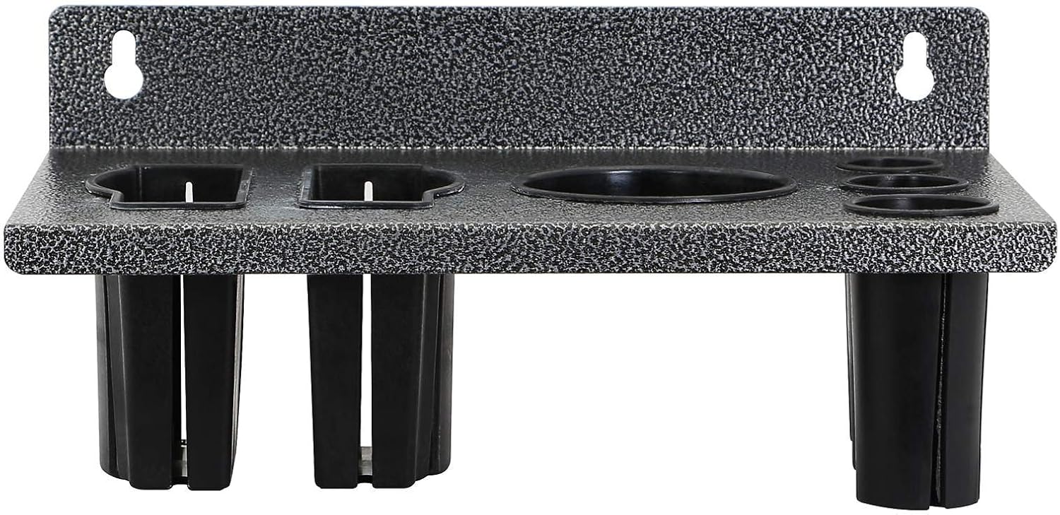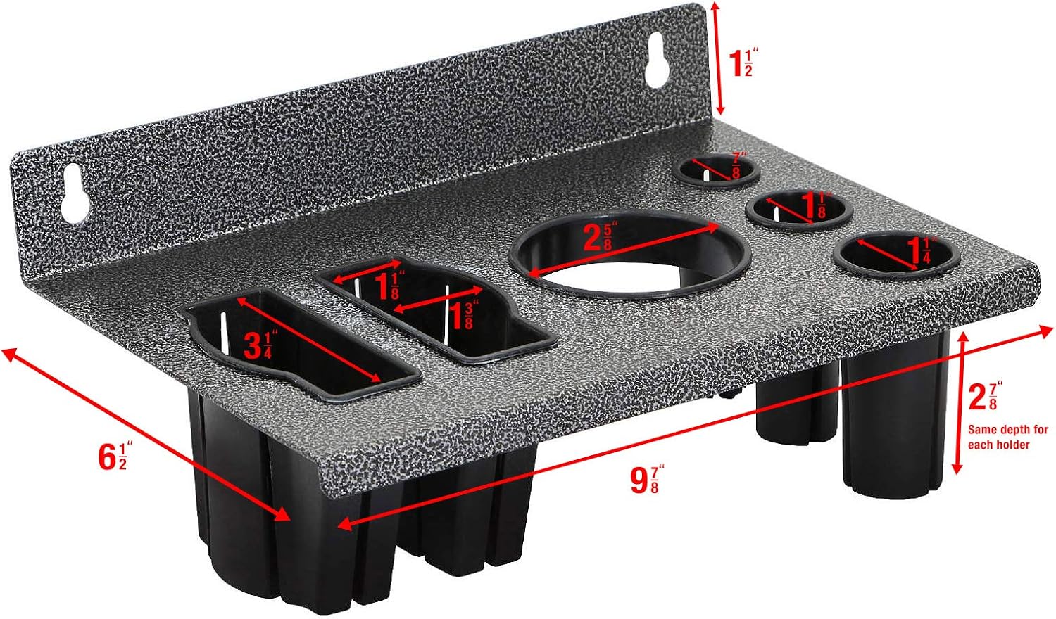This convenient salon appliance holder is designed to store and organize blow dryers, heat irons, straightening irons, curling irons, hot combs and other accessories, Both space saving and portable, it can be wall mounted, unhooked and moved where needed throughout your salon as a tabletop caddy, or brought to client meetings to create a professional workspace. A 2-5/8″ (diameter) storage ring allows you to quickly stow and retrieve your blow dryer, including those fitted with nozzles or other attachments. It can also fit and store almost any flat or round hair iron and includes two rectangular storage compartments measuring 3-1/4″ Length x 1-1/8″ Width x 2-7/8″ Depth, both with a rounded area extending the width to 1-3/8″. The three storage tubes each measure 1-1/4″, 1-1/8″, and 7/8″ (diameter) x 2-7/8″ (deep). This appliance holder is extremely durable; constructed from high-grade steel in a heat resistant hammered finish, it is very attractive and will last for years and years. Additionally, each storage compartment is made of tough jet-black composite. Overall dimensions: 9-7/8″ Width x 6-1/2″ Depth x 4-1/4″ Height with an overall weight of 1.6 pounds. The rear mounting lip measures 9-7/8″ Width x 1-1/2″ Height. Two screws and anchors for wall mounting are included in the box.
