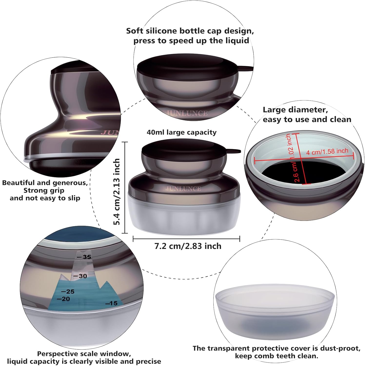 【Comfortable and even application】 Hair oil dispenser has 14 flexible stainless steel rolling teeth and 7 auxiliary teeth for a comfortable experience. Press down lightly to apply the liquid evenly and controllably. Prevent leakage when not in use.