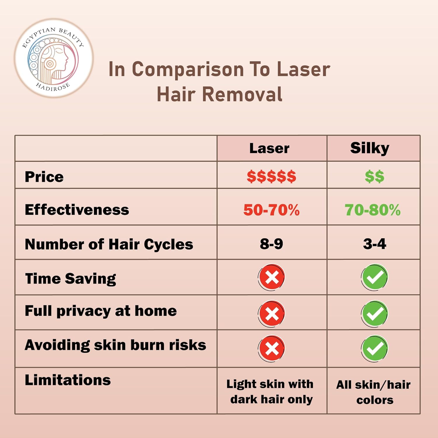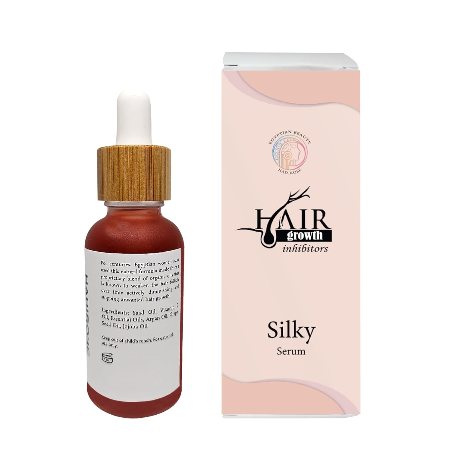 For centuries, Egyptian women have been using this uniquely natural formula that is created from a proprietary blend of organic oils which is known to weaken the hair follicle over time by activley diminishing and stopping unwanted hair growth while protecting the skin from dehydration. Its vitamin E content gives it antioxidant properties, thus protecting the skin from premature aging. It is one of the oldest Arab hacks to reduce hair regrowth gradually by weakening the hair follicles every time you use it until it disappears completely. Our Silky Serum is a permanent hair removal alternative to laser or chemically-based products. 100% naturally formulated hair growth inhibitor that keeps you silky smooth with permanent results. Noticeable effects within 3 weeks of the first applications. Unique formula is safe, pain free, and simple to use. All of our ingredients are 100% Natural, Handcrafted, Sustainable & Cruelty Free. There are absolutely no harmful chemicals, sulfates, parabens, silicones, aluminums, or alcohols used in the crafting of our products.
