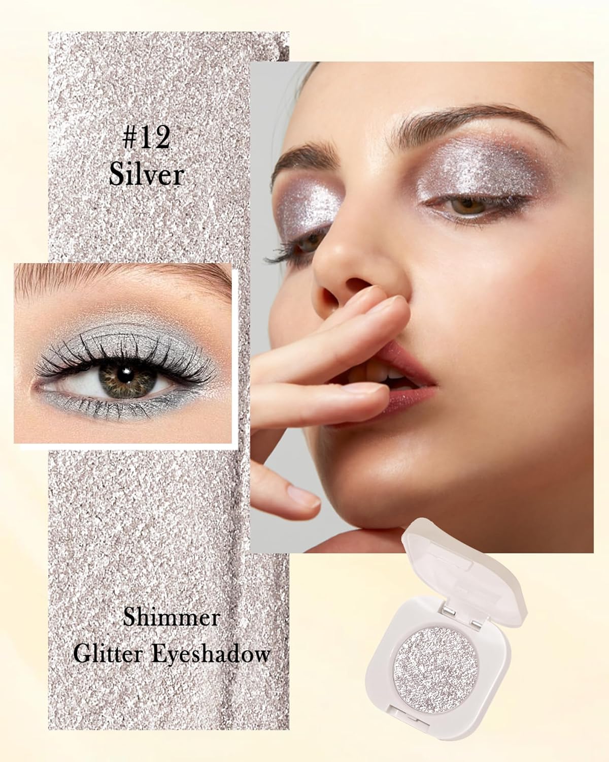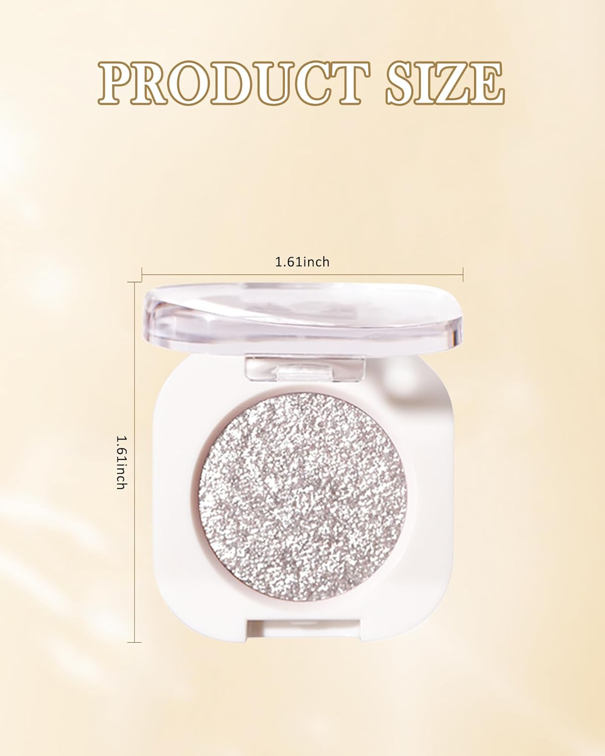 Single Shimmer Glitter Eyeshadow, Metallic Silver Glitter Eye Shadow Palette, Metal Sparkling Eyeshadow Eyeliner Compact Powder, High Pigmented & Long Lasting, Intense Color Silver Eyes Makeup, Sliver