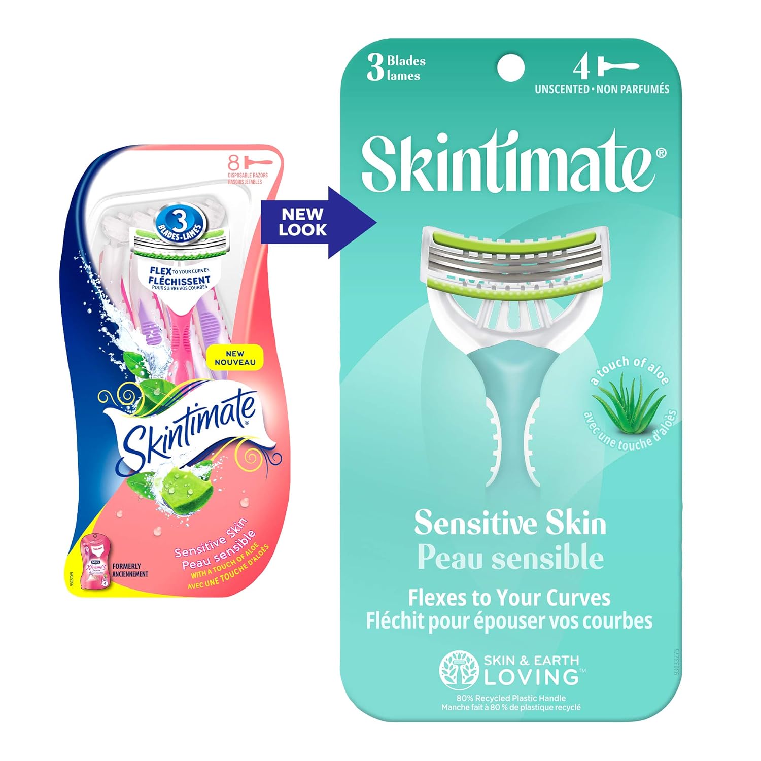 Skintimate Sensitive Skin Disposable Razors feature a triple-blade design that flexes and pivots to adapt to your curves and an ergonomic handle with a soft rubber grip for ultimate control. The conditioning lubrication strip is formulated with a touch of Aloe and Jojoba to enhance razor glide and help protect sensitive skin against irritation. For an optimal shaving experience, use your razor with the Skintimate Sensitive Shave Cream.
