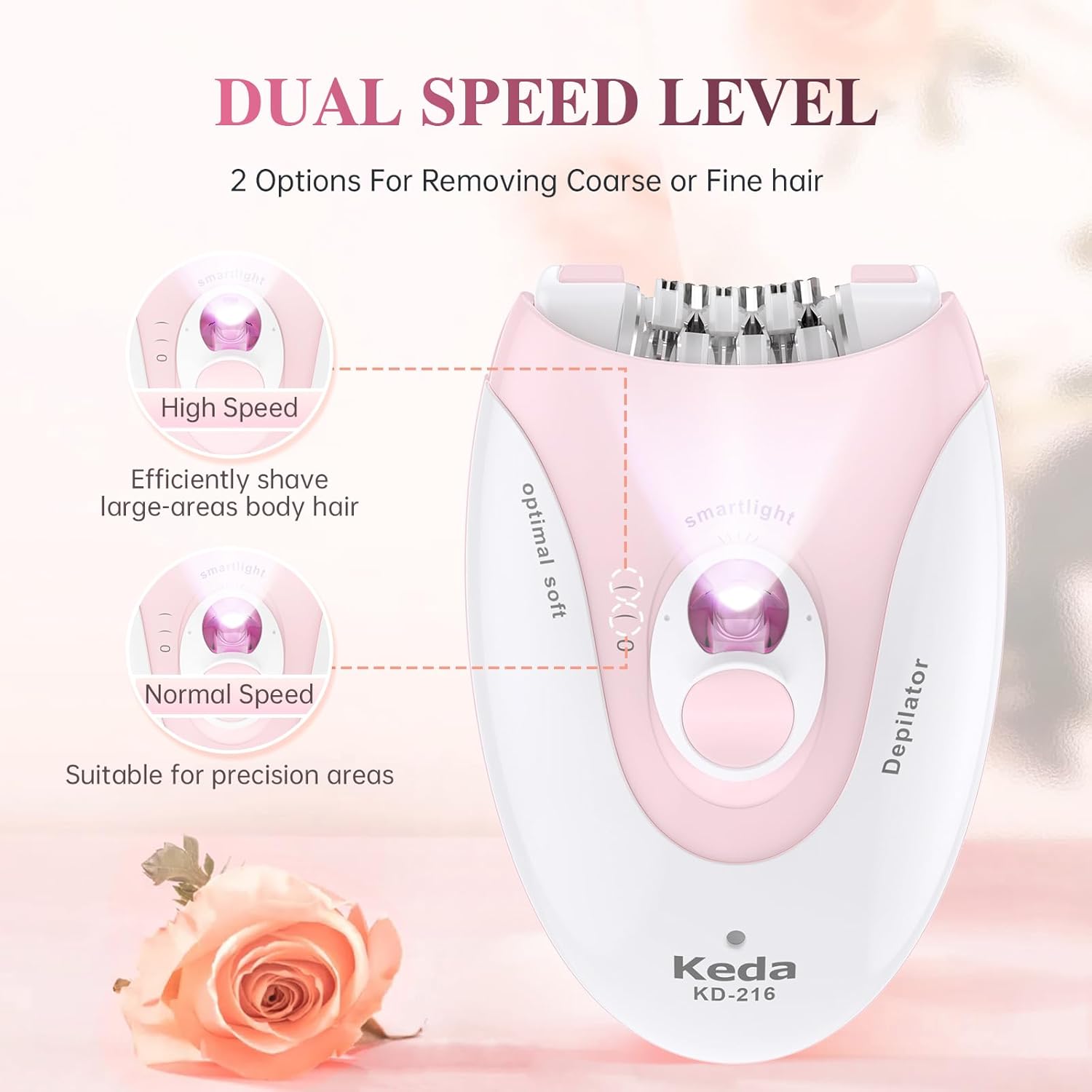 🌸【2 Speed Setting for Long or Short Hair】2 speed settings to remove thinner and thicker hairs for a more personalized hair removal treatment. Speed 1 for extra gentle epilation, and speed 2 for an extra efficient epilation. Suggest use the speed one for beginners.