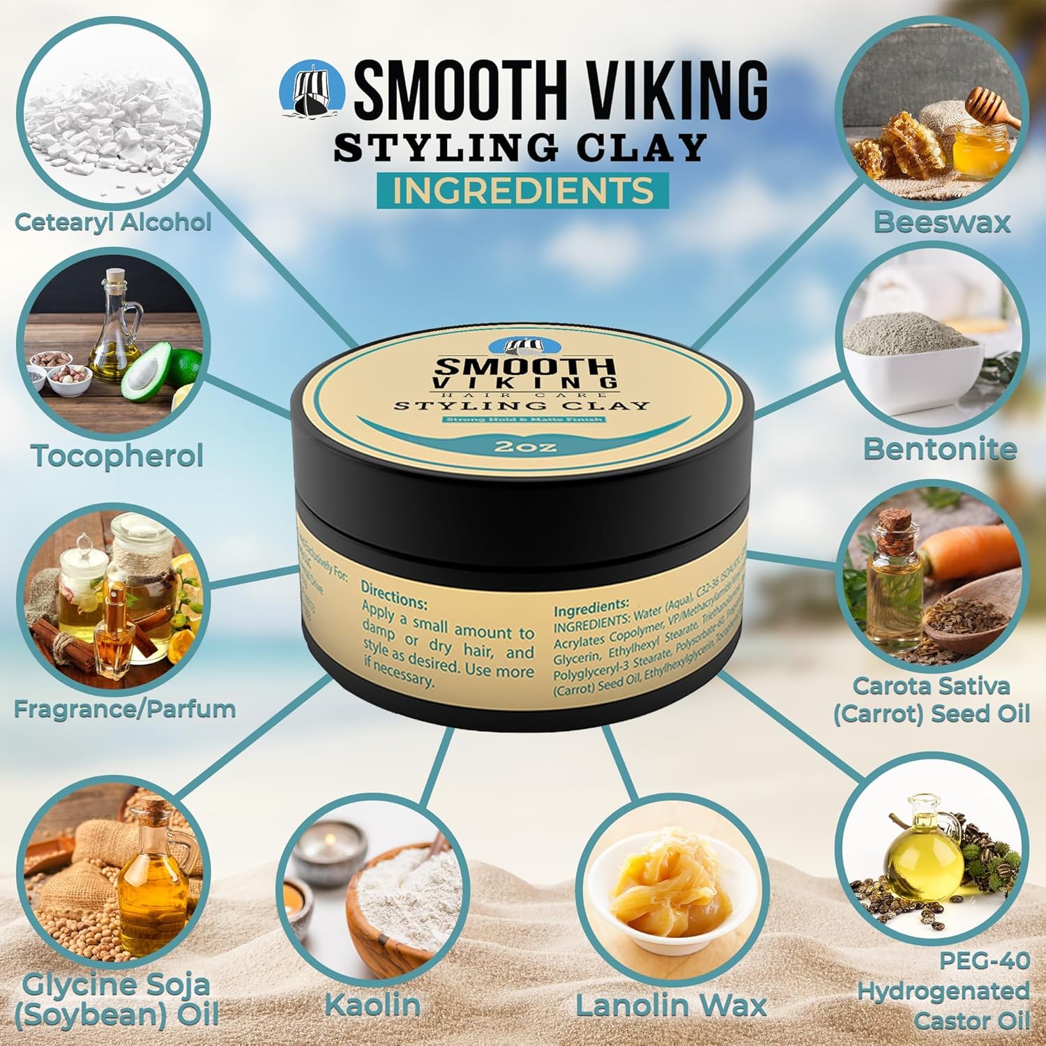 Smooth Viking Hair Clay for Men – Strong Hold, Hair Cream for Men, Clay Pomade for Men, Hair Paste for Men, Hair Styling Clay, Mens Hair Products, Hair Styling Products Matte Finish, Made in USA, 2oz