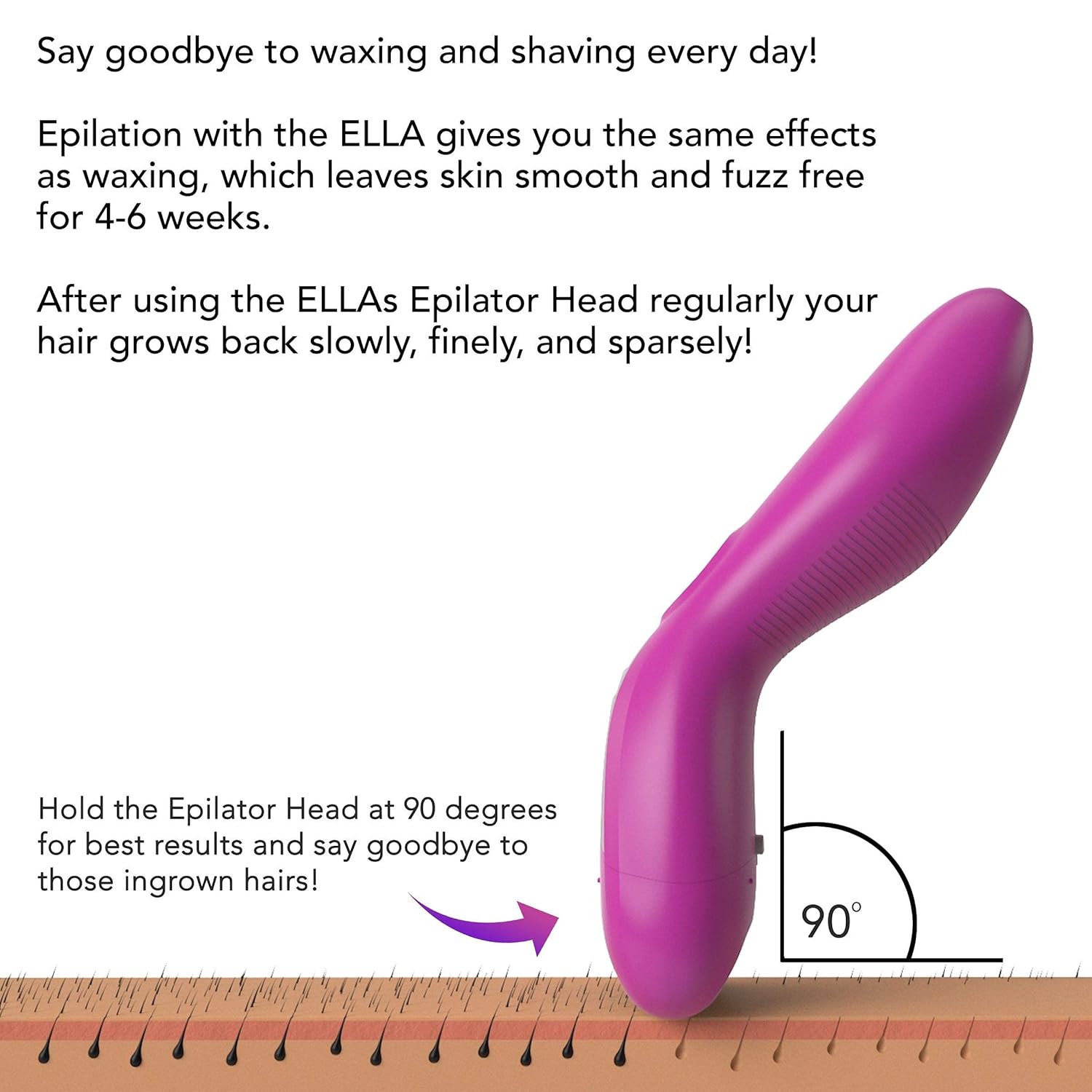 HAIR REMOVAL – The epilator head is comprised of 32 tweezers that enable effective and quick epilation by removing hair from one direction to prevent ingrown hairs. The Lady Shaver is a fine, gentle hair removal head to use on the most sensitive parts of your skin. The ELLA removes hair for silky smooth skin for up to 6 weeks.