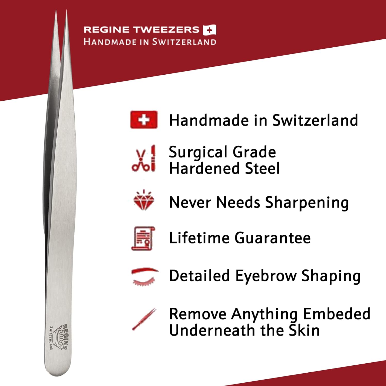 HANDMADE IN SWITZERLAND: Regine Tweezers are 100% handmade in Switzerland and backed by over a century of tradition.