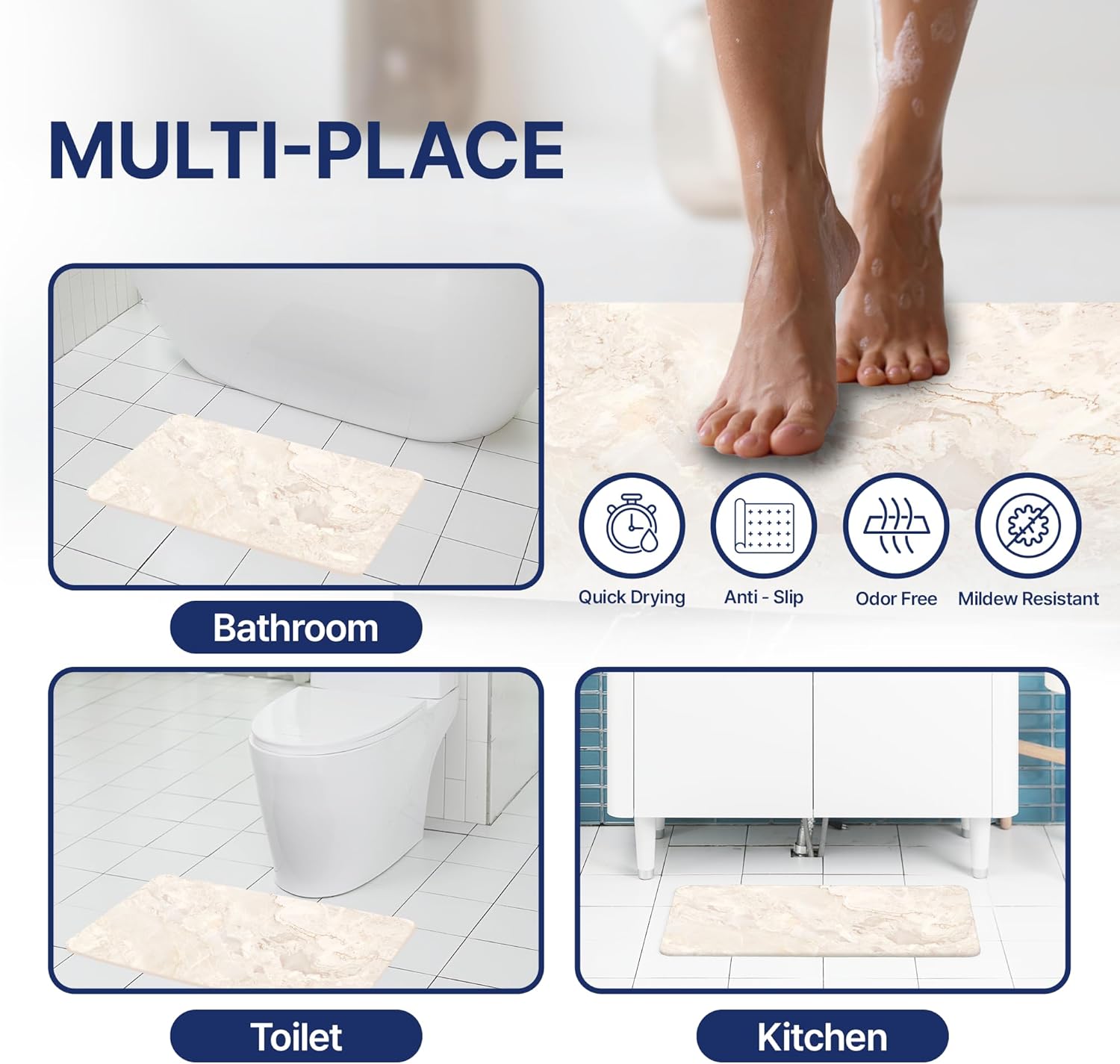 【Versatile Usage】This thin bathroom mat is designed to fit under the door and can be used in various settings. Whether in the bathroom rug runner, kitchen mat, laundry room, vanity, sink, hallway, or RV mat, this diatomite stone bath mat adds a stylish and functional touch to any space.