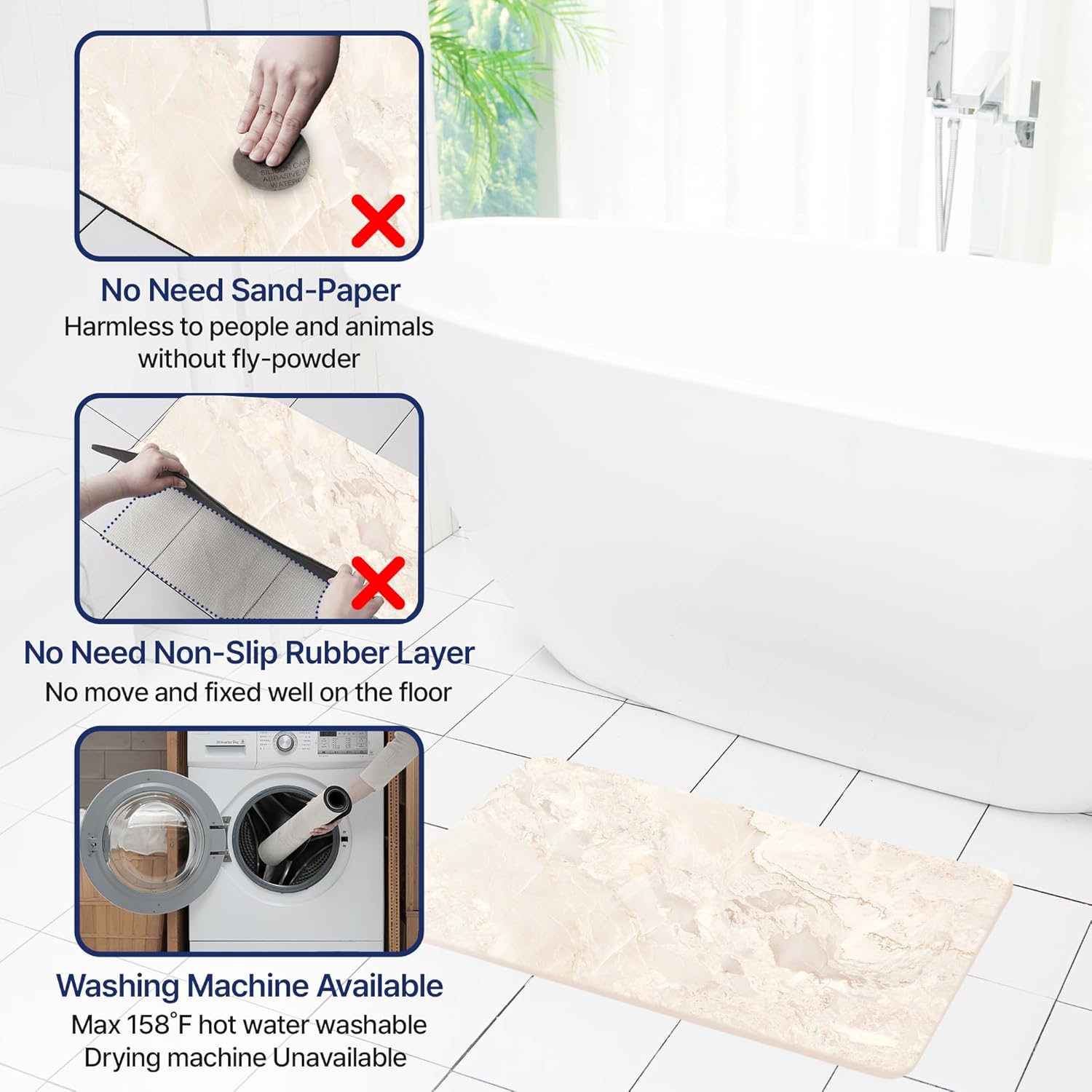 【Quick Absorbing & Fast Drying】 The stone bath mat for bathroom is a flexible stone bath mat made of diatom mud material, which is easier to dry than other normal plush bath mats. This water absorbing bath mat is designed to absorb water from wet feet immediately, watermarks will disappear within few minutes. Enjoy a dry and comfortable experience after your shower.
