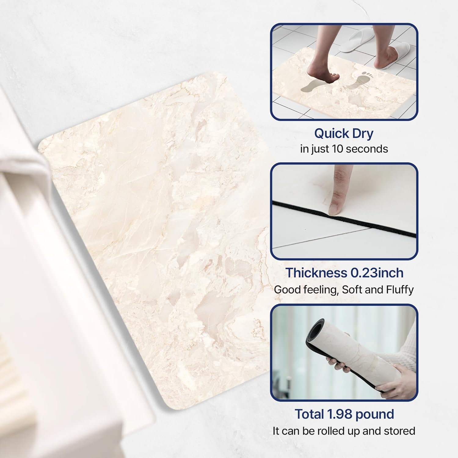 Stone Bath Mat, Diatomaceous Earth Shower Mat, Non-Slip Natural Rubber, Super Absorbent Quick Drying Bathroom Floor Mat, Easy to Clean (27.55″ x 15.74″ Light Beige Marble)
