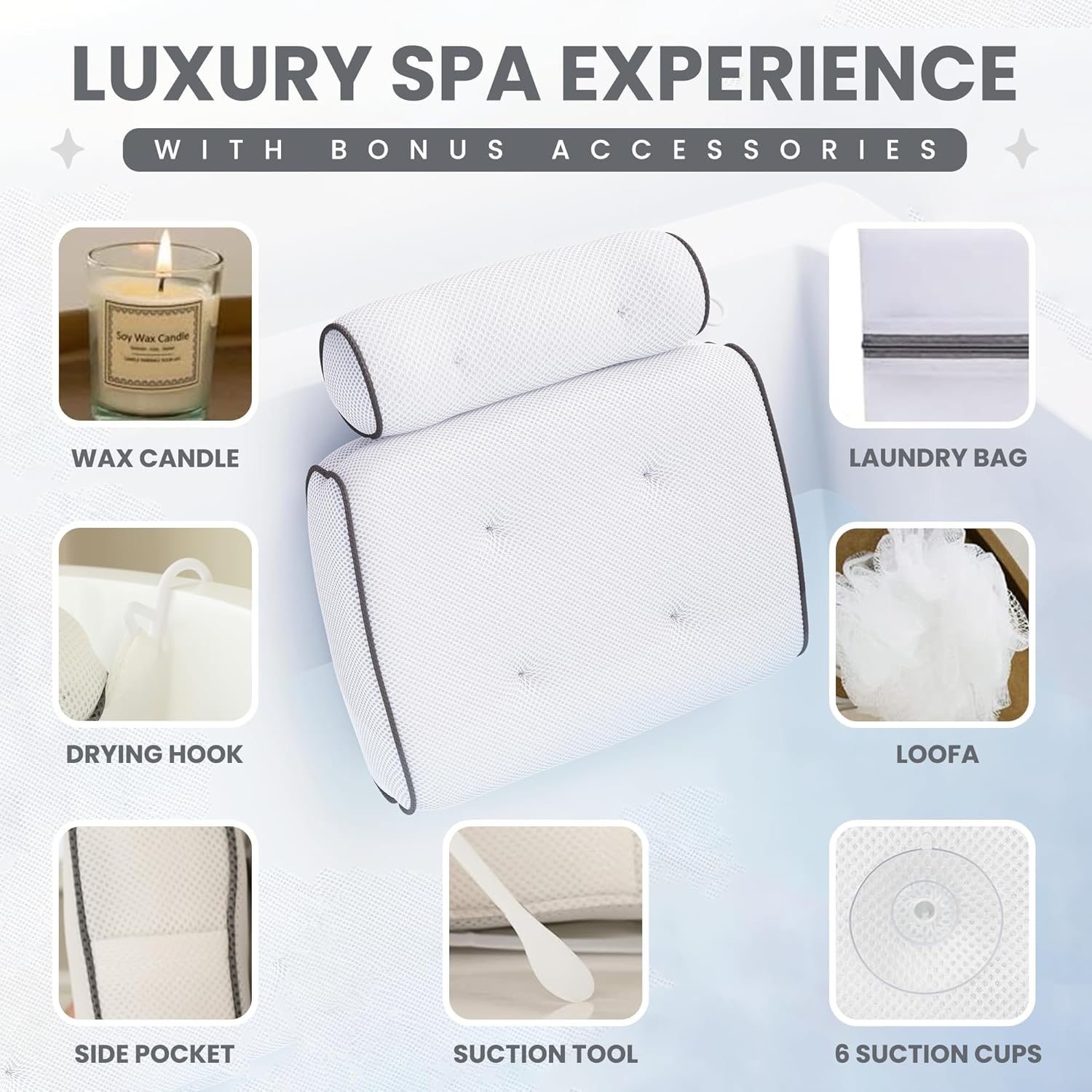 Luxury Spa Experience with Bonus Accessories: Transform your bathroom into a spa retreat with our deluxe spa pillow, complemented by bonus accessories. Unwind with the non fragranced wax candle, pamper your skin with the included bath loofa for a cleansing experience, and utilize the suction tool, mesh laundry bag, and hook for convenient removal, storage, and maintenance of your bath essentials.