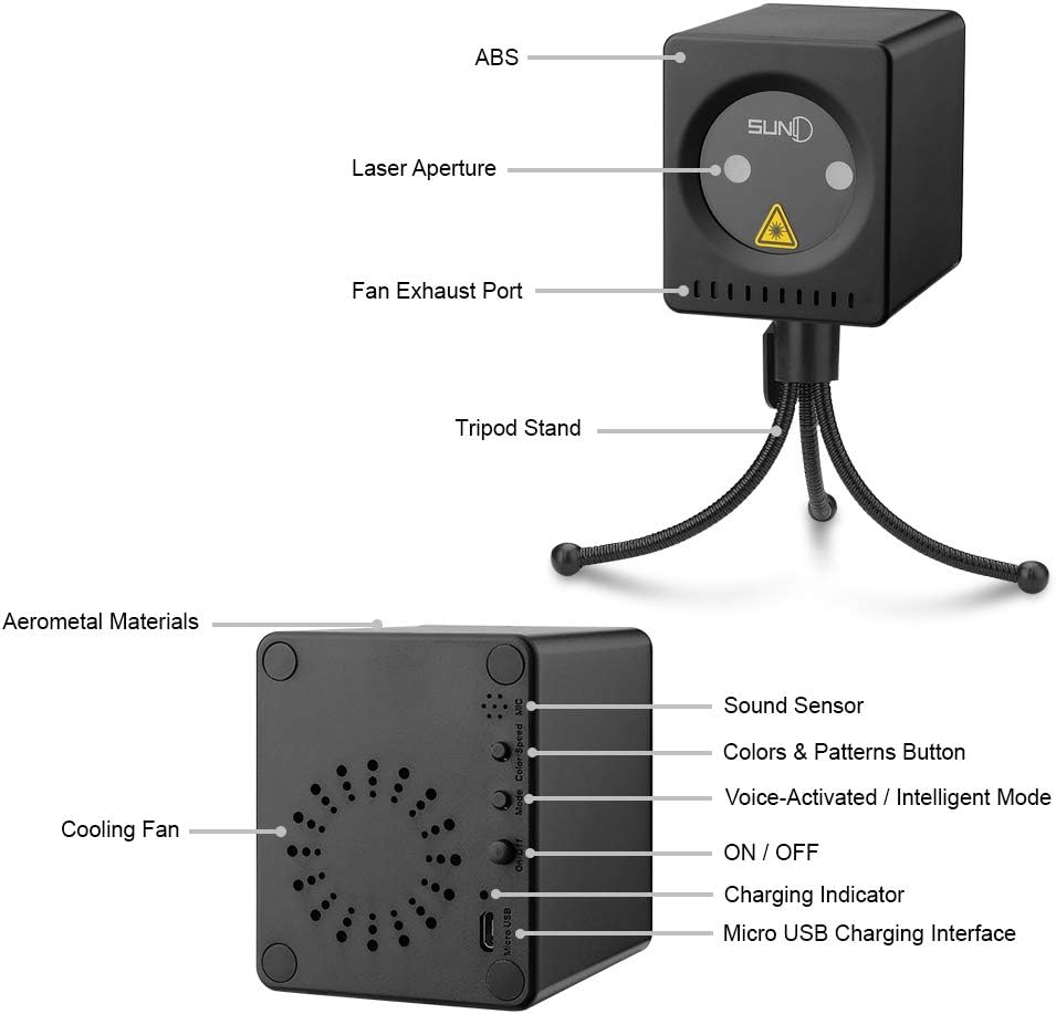 Model Number PLB-A200RG External Color Black Diode Colors Red + Green Pattern Fantastic and Magical Green Aurora Patterns with Red Stars Dots Design Effects Lights Projection Rate < 5mW Light Class Class IIIa / Class 3R; Certified by FCC, FDA, CE and RoHS. This product fully complies with the standard of the above Certificates. Warm Up Time 0-5 Minutes Using Places DJs, Bands, Bars, Pubs, Clubs, Christmas Party, KTV, Family party, Birthday party, Celebration, Wedding, Festival, Mall, Store, Shop etc. Play Mode Sound Activated / AUTO /Simultaneous for both of Auto and Sound Activated Modes Material Aero Metal Materials + ABS Dimension 63 x 80 x 75 mm (336 g) Battery 5000mAh rechargeable lithium battery, more convenient and more affordable.