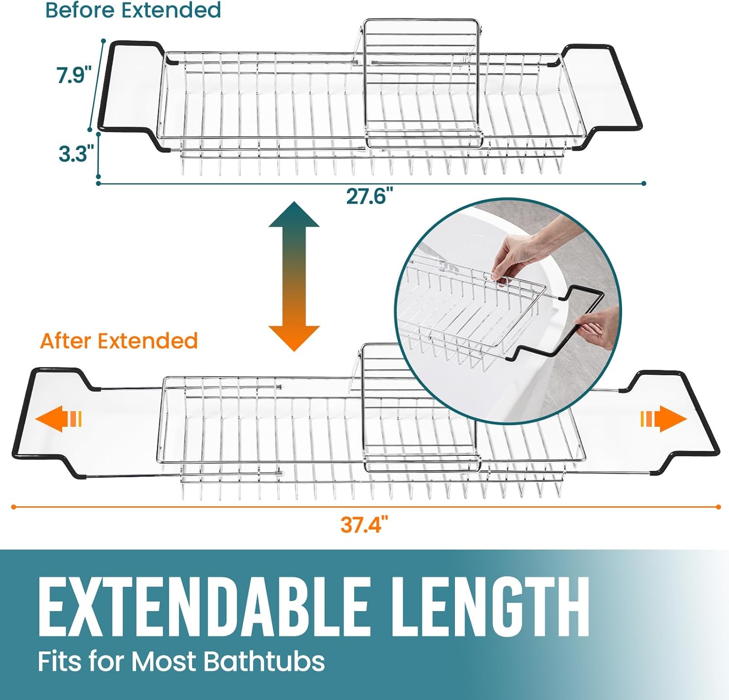 【Expandable & Protect Your Bathtub】Adjustable bath tub caddy length from 27.6 inches to 37.4 inches, suitable for most sizes of bath tubs. The non-slip silicone handle helps to secure the bathtub caddy in place and prevent any personal items from falling into the water and scratches.