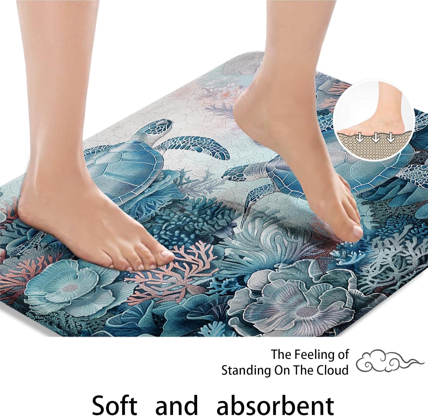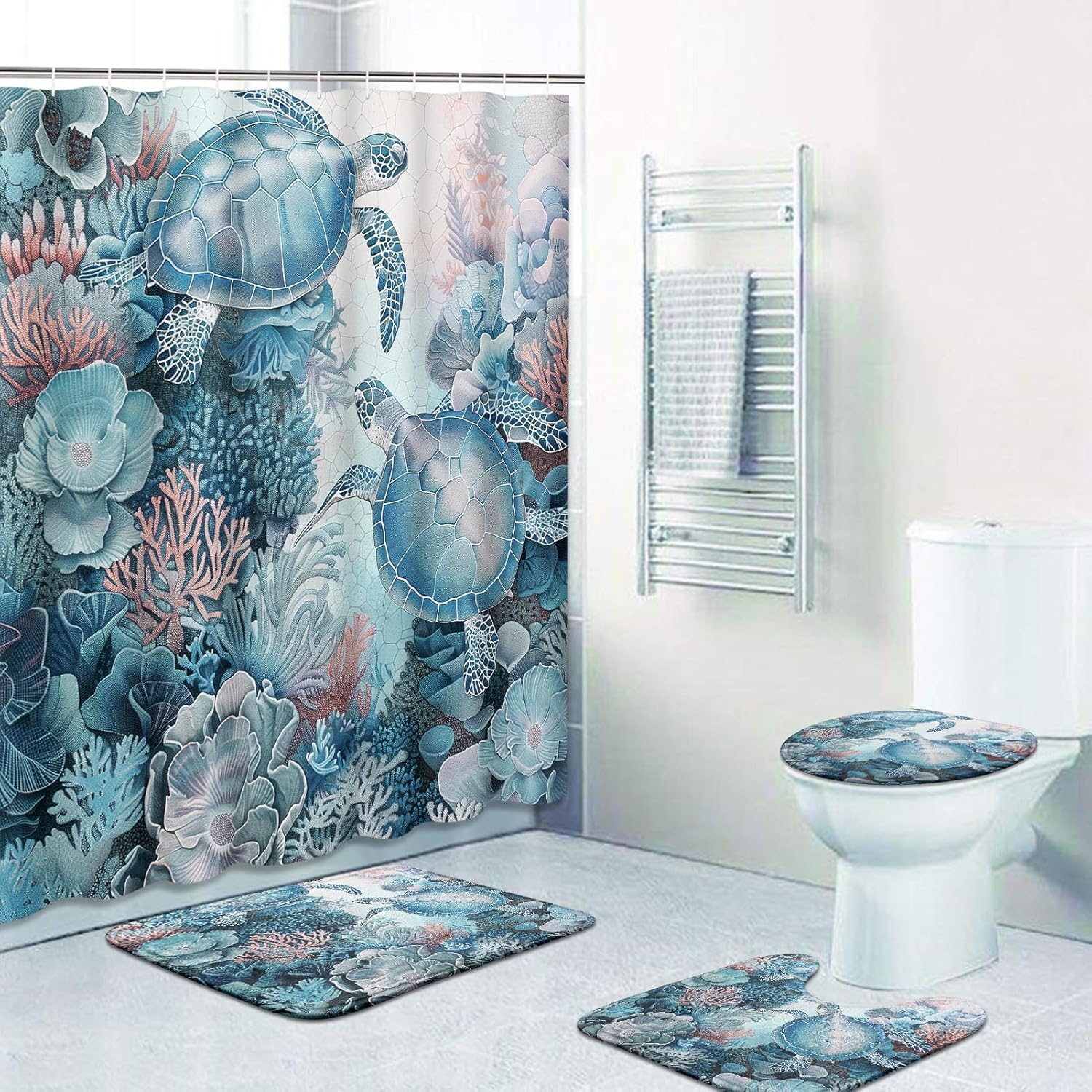 Teal Turtle Bathroom Sets with Shower Curtain and Rugs and Accessories, Sea Beach Shower Curtain Sets, Ocean Underwater Shower Curtains for Bathroom,Summer Coral Bathroom Decor 4 Pcs