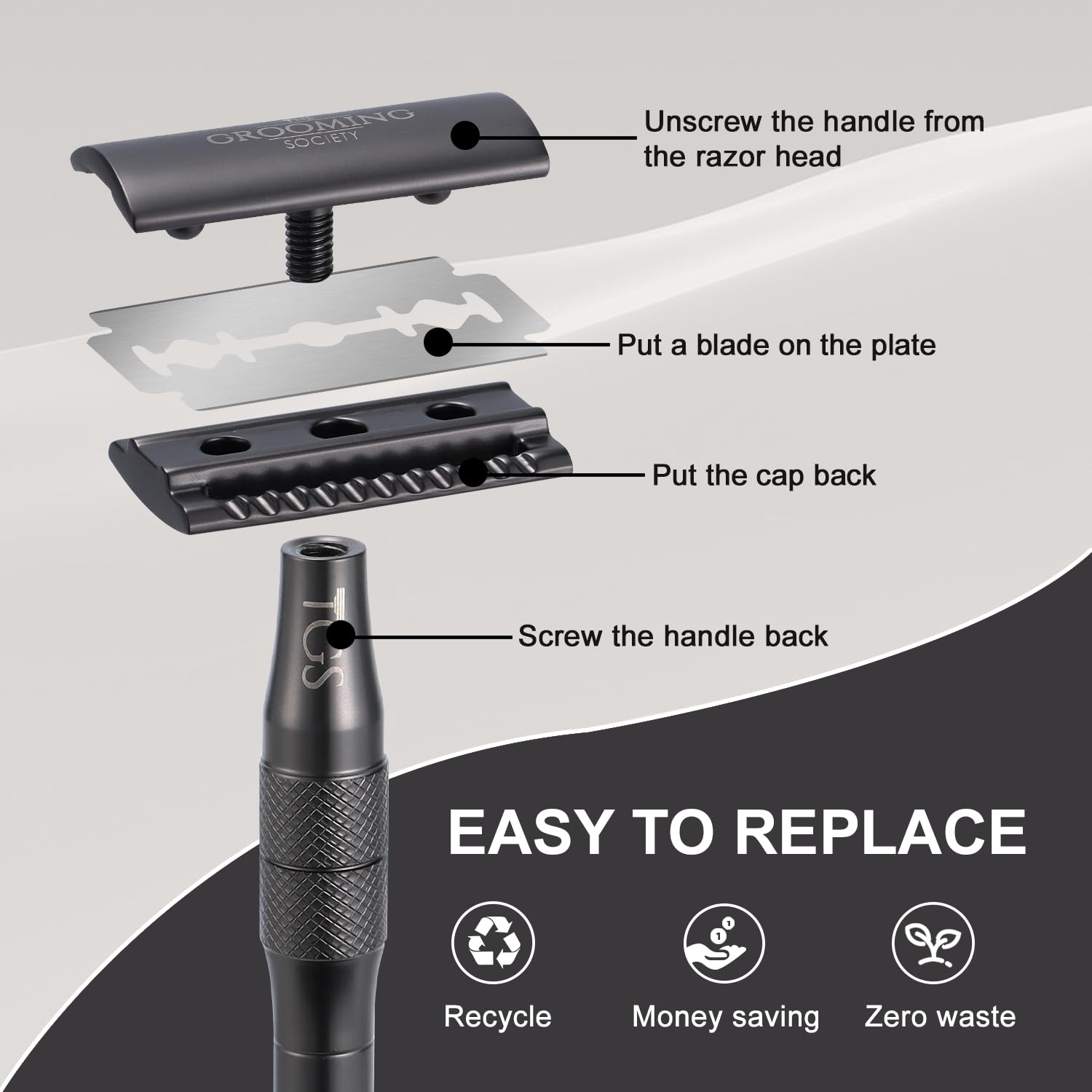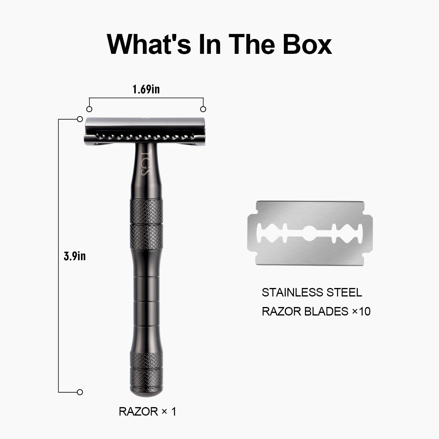 TGS Safety Razor with 10 Double Edge Blades Refills, Single Blade Razor, Zero Waste Reusable Razor for Men Women, Smooth Closed Shave – Matte Black