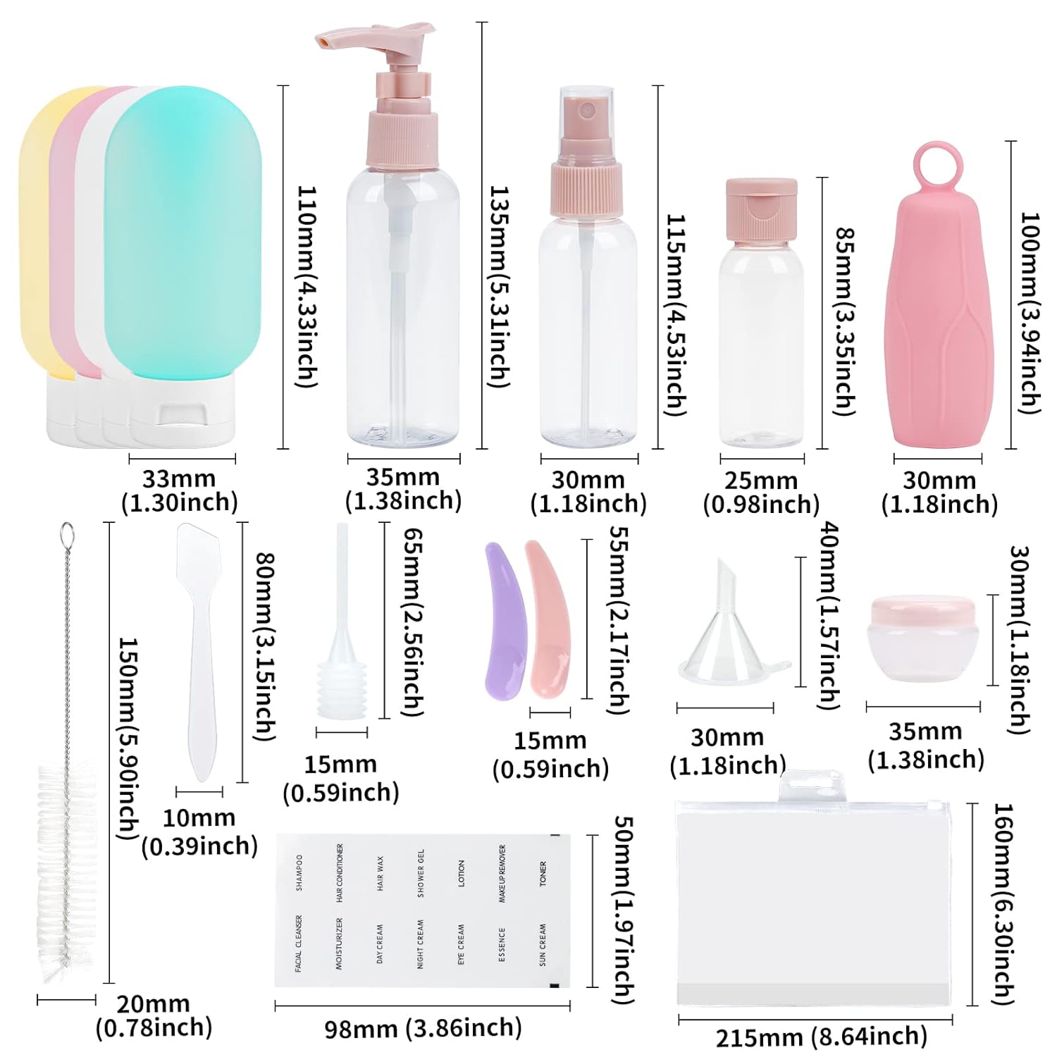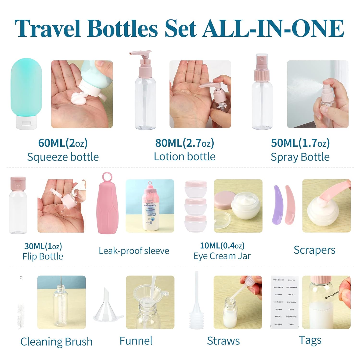 [Reusable Travel Bottles Set] Our travel container set includes 4* squeeze bottles, 1* pump bottle, 1* spray bottle, 1* flip-cap bottle, 3* jars, 3* scoopers, 1* funnel,1* dropper, 1* elastic sleeve for leak proofing, 1*PVC bag, 1* clean brush, and 1*page label.Different accessories for your different needs