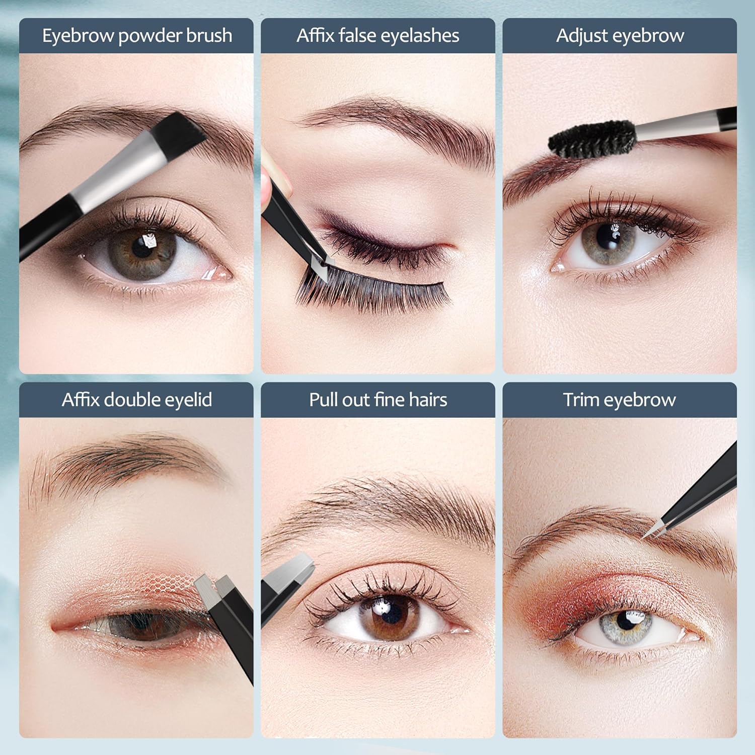 ❤️Tweezer Set 6 Pcs: contains flat tweezers, angled tweezers, pointed tweezers, slant tweezers, and two uses of eyebrow brush.