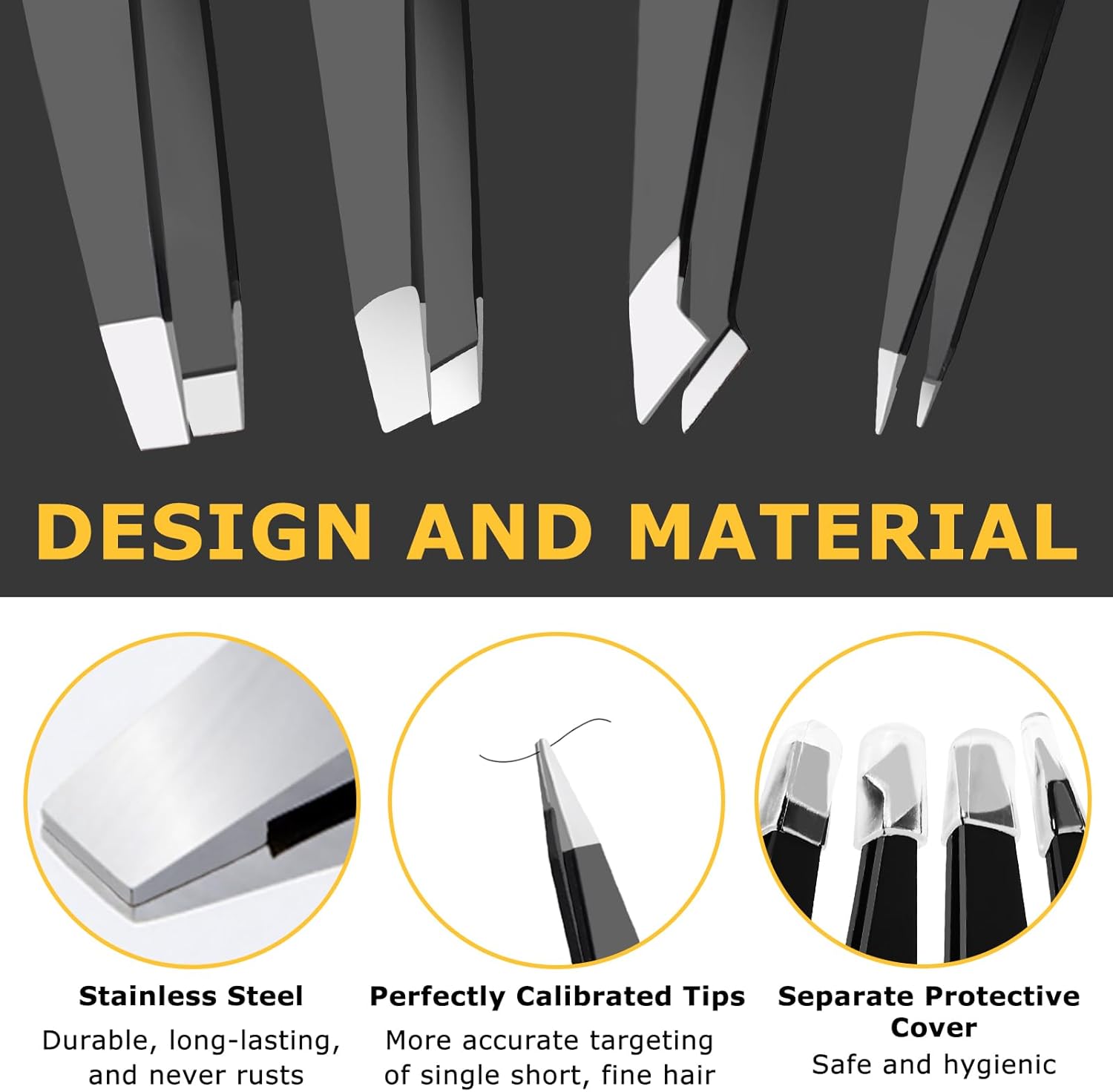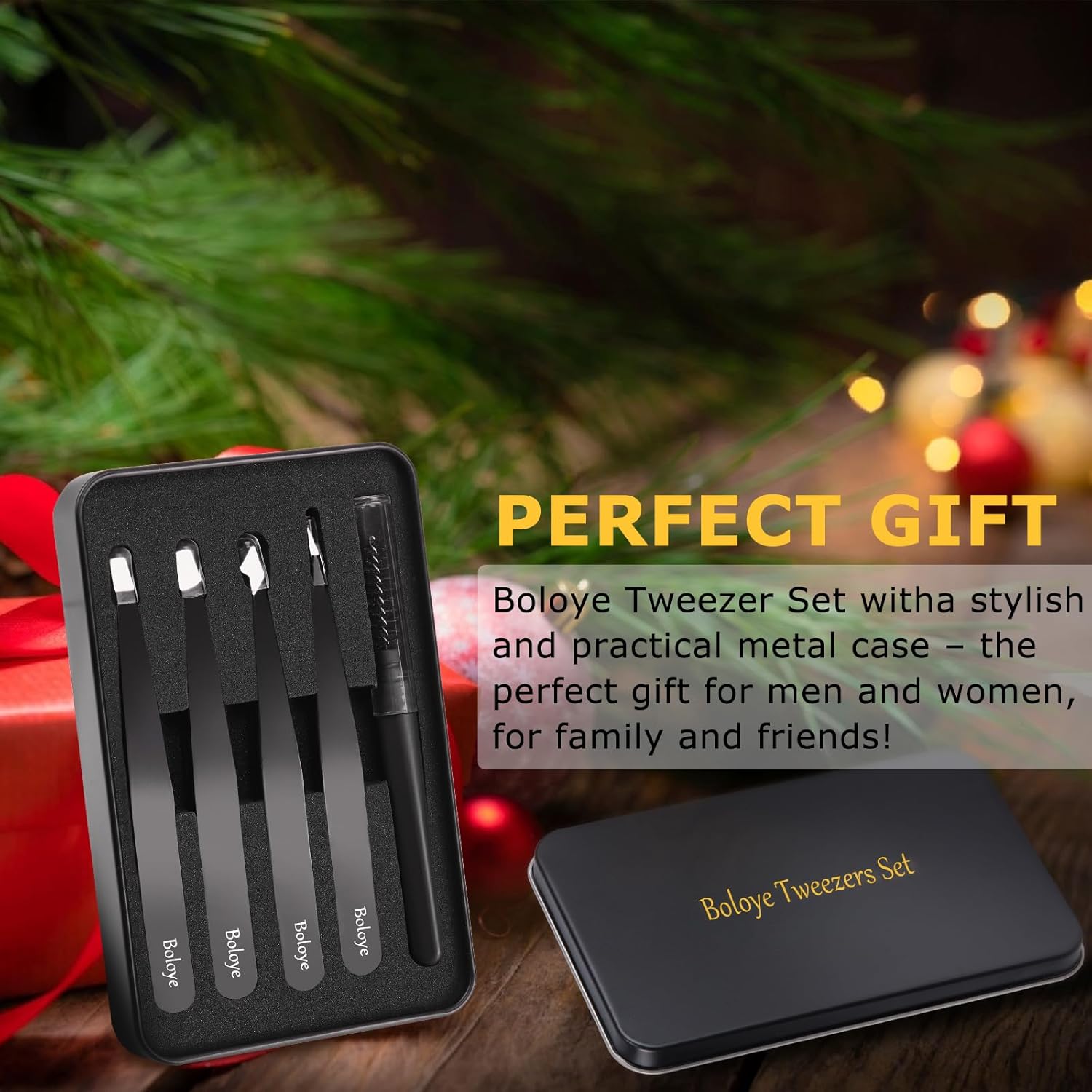 Tweezers Set, 4Pcs Eyebrow Tweezers and an Eyebrow Brush with an Metal Case, Professional Stainless Steel for Men & Women, Precision for Facial Hair, Splinter and Ingrown Hair Removal