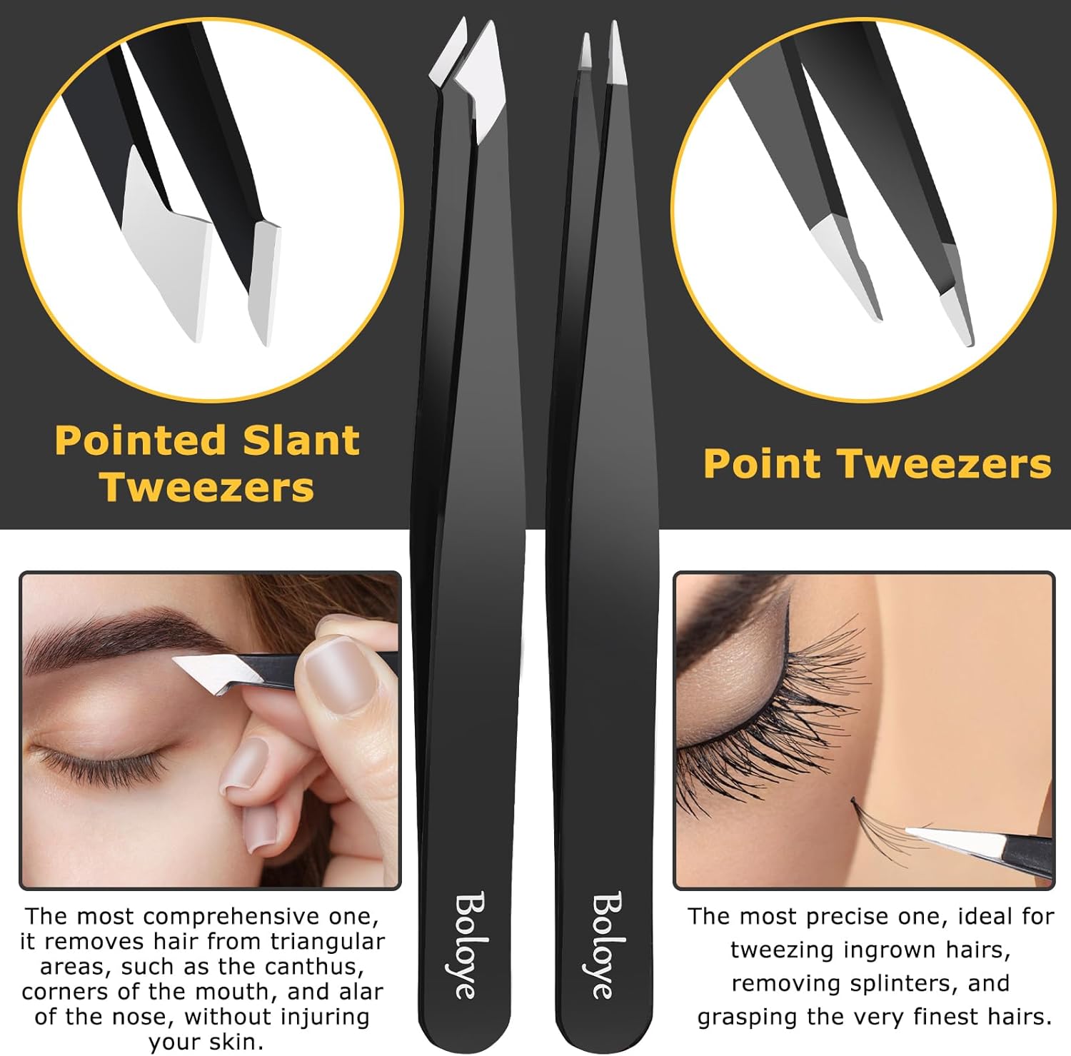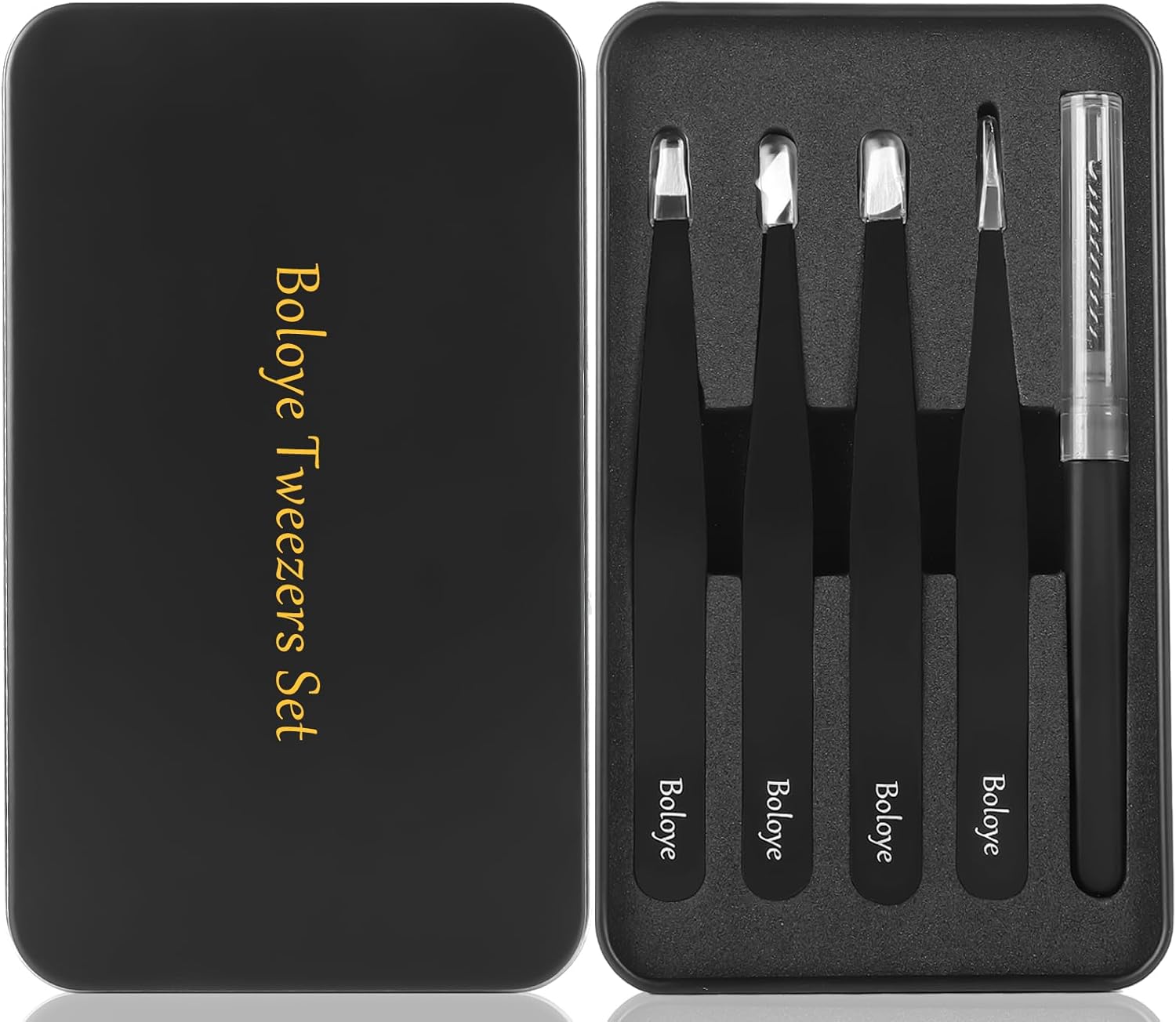 【Versatile 5-in-1 Tweezers Set】This set contains a pair of classic, slant, pointed, and pointed slant tweezers, providing effective hair removal solutions for various facial areas, including chin hair and ingrown hairs; The included eyebrow brush is ideal for shaping, blending, and grooming both eyebrows and eyelashes.