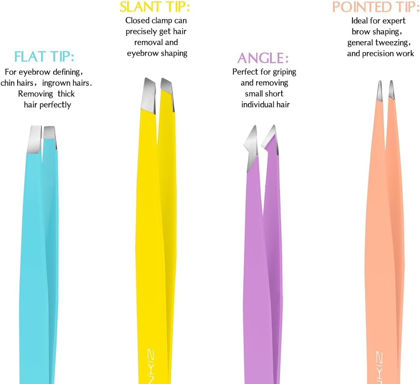 FLAT TWEEZER: For eyebrow defining, chin hairs, ingrown hairs. Removing thick hair perfectly.SLANT TIP TWEEZER: First-Aid needs. For the most of eyebrow, give you the perfect style.POINT SLANT TWEEZER: Oblique quick removal of fluff, for triangle area accurately. Fine brow without damaging eyelid.POINT TWEEZRT: Sharp point grab hair easily.