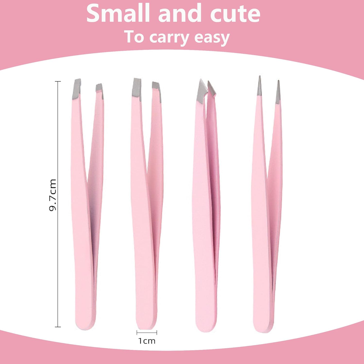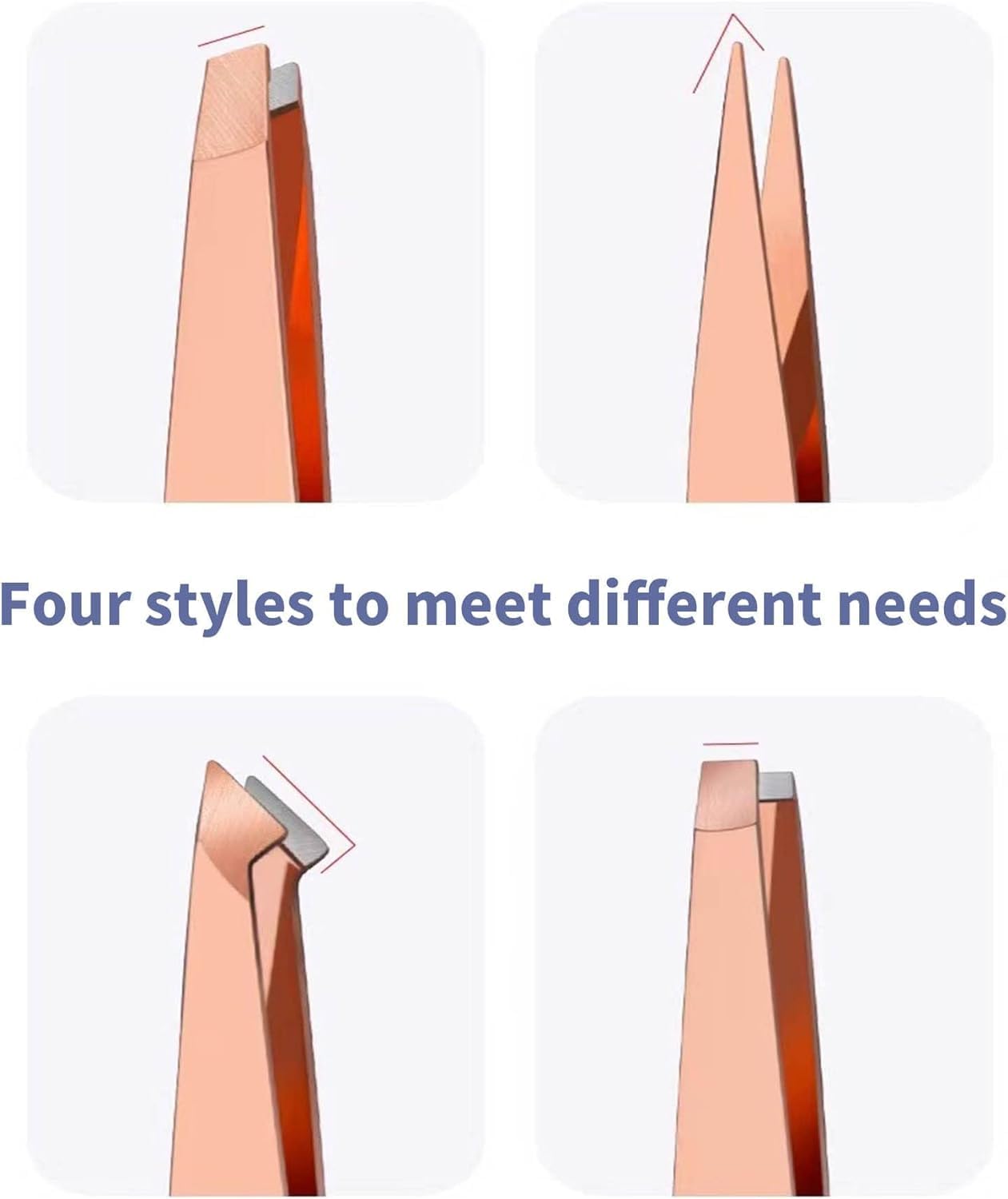 Flat,Angled,Pointed and Slant tweezers to meet a variety of needs.Flat tip tweezers can be useful for removing hair from the eyebrows. Slant tip can be used for removing hair on the skin that often comes with a curve. Pointed tipped tweezers can be useful for removing ingrown hair, angle tipped tweezers can can remove hair from the triangular area of the lower part of the eyelid.