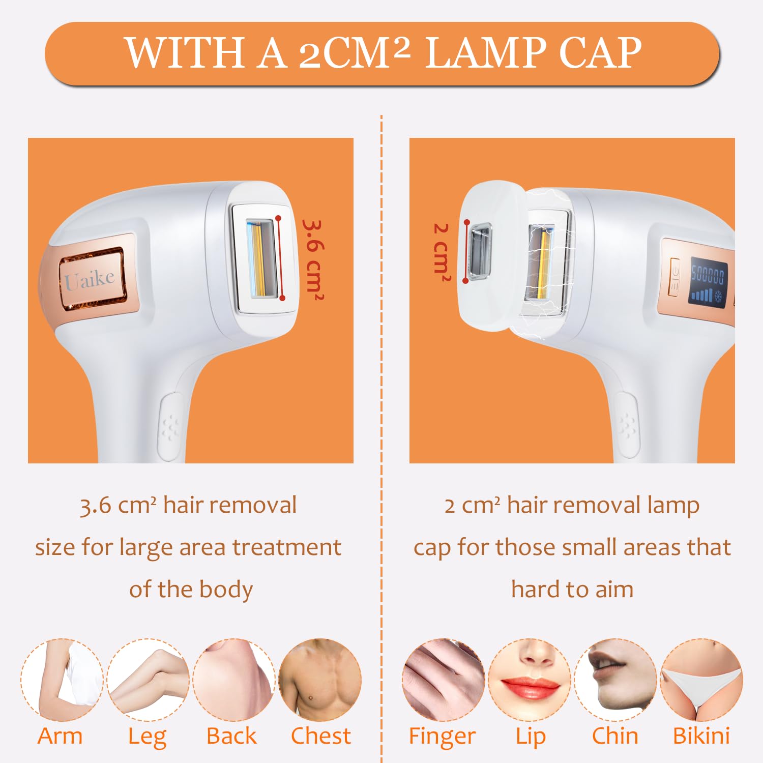 🌻Cold Compress Function And Two Different Flash Window: Uaike home use hair removal device has ice compress function, which can relieve the heat and keep the skin calm. Easy to use, just turn on the ice mode button to enjoy a painless and comfortable process. It just meets your needs. It has two different flash windows: Its own flash window size is 3.6cm², can be used for faster hair removal of large areas. And with a 2.0cm² flash cap for small areas such as finger, chin etc.