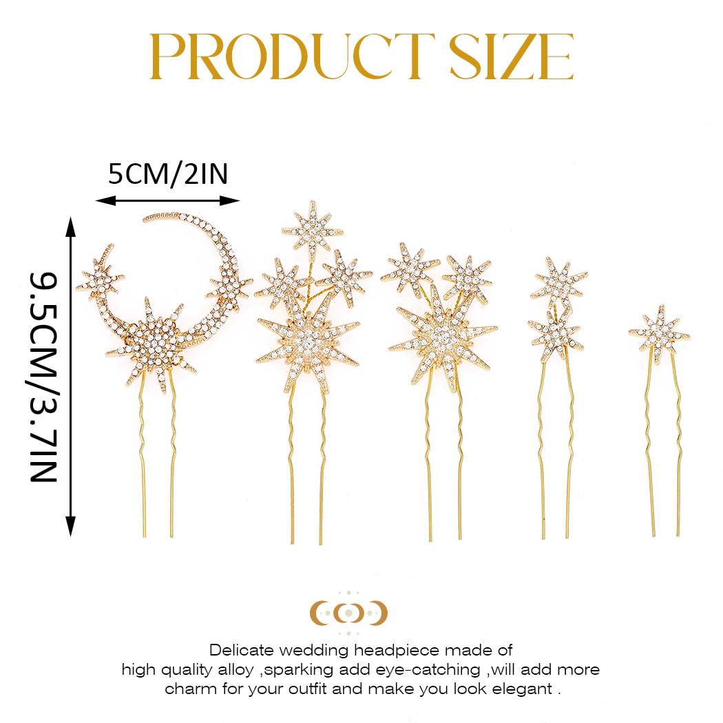 Unicra Star Moon Bride Wedding Hair Pins Crystal Bridal Hair Pieces Rhinestone Goddess Hair Accessories for Women and Girls (Pack of 5) (Gold)