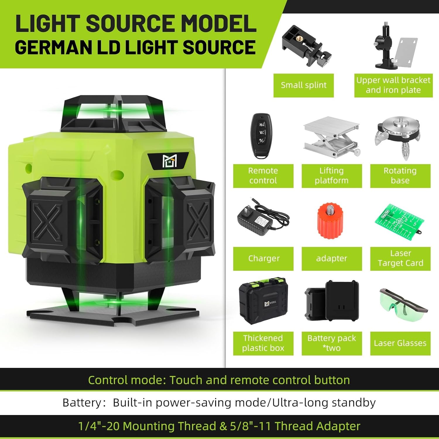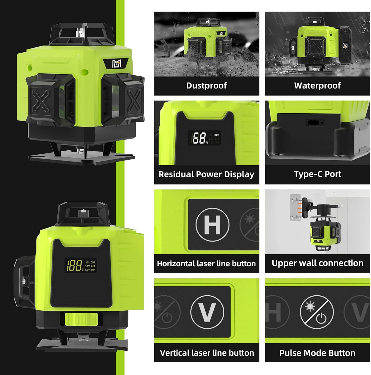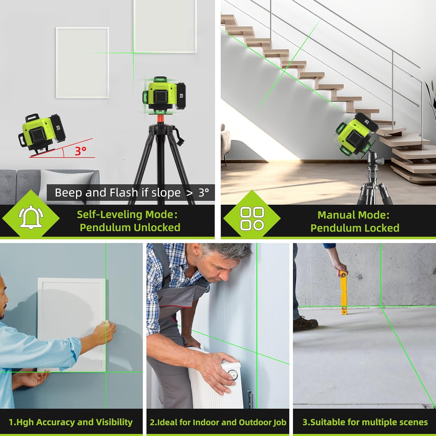 [4×360° Full Layout ] 360° 8 horizontal lines/360° 8 vertical lines of laser level 360 self leveling cover all around the room. The 360 laser level self leveling has 2 horizontal 360° planes and 2 vertical 360° planes. The laser level 360 self leveling intersect at 90° to make the user quickly visualize and finish the square layout. Each button on this level laser 360 corresponds to a single laser line, you can easily choose to turn on/off any laser line. The laser level self leveling makes you easily ceiling installation, paving tiles, installing drawings, windows, furniture carpentry, hanging wallpaper, and stairs.
