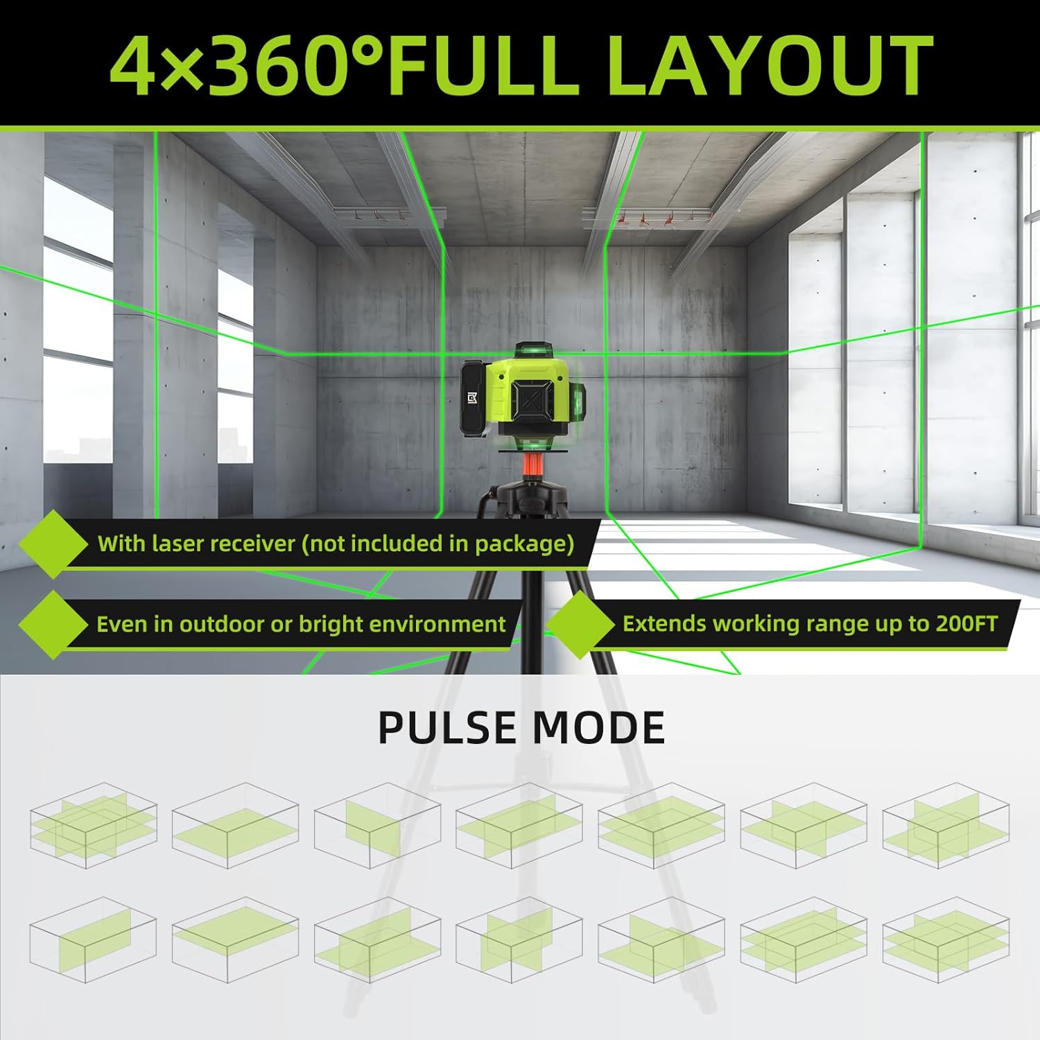 [Multi Mode Switching ] When you use laser level 360 self leveling can select self leveling or manual mode,Unlock the pendulum, the 360 laser level will self-level within 3°(otherwise the laser will keep flashing). Lock the pendulum to switch to the manual mode, meet your alignment needs from different angles. Pulse mode function extends laser working range up to 200Ft.