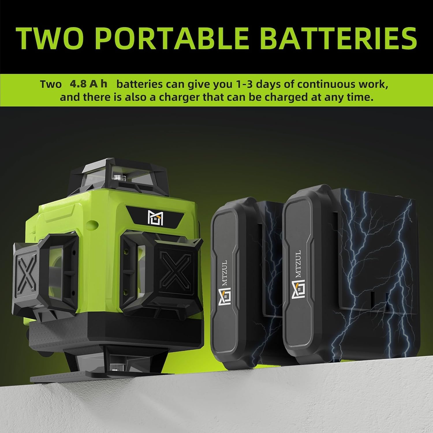 [Control And Endurance& Type-C Charging Port ] Remote control with the laser level 360 self leveling, your alignment job becomes simple and fast. The remote control has a range of up to 38 feet and can even control through walls. Two 4.8Ah batteries can give you 1-3 days of continuous work, and there is also a charger that can be charged at any time. The Rechargeable battery comes with a Type-C charging port that can be charged separately. The 360 laser level has strong black carrying case with foam for safe organization and easy carrying.