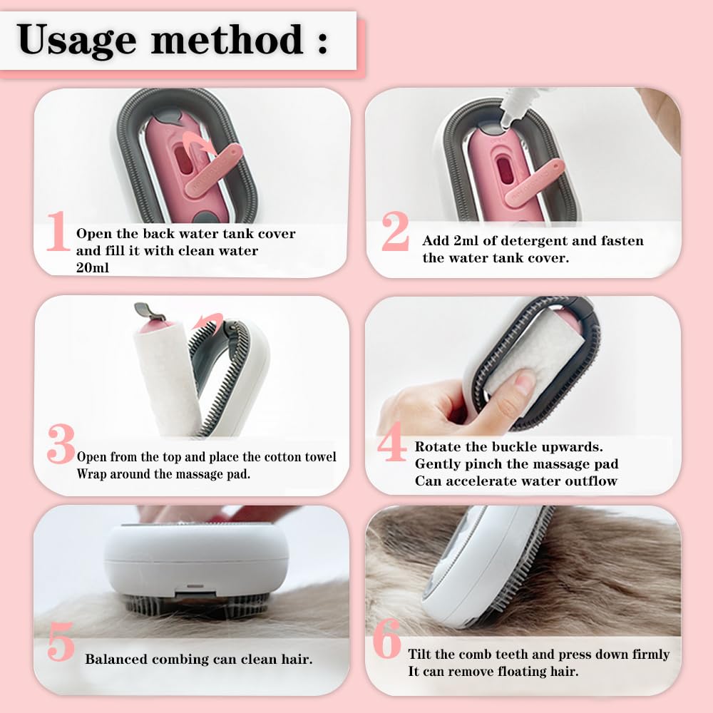 【2 in 1 Cleaning Brush Comb】Add water and no-rinse cleaning liquid to the water tank, then wrap a cotton towel on it. Reducing the times of cat bath when cleaning and removing loose hair.