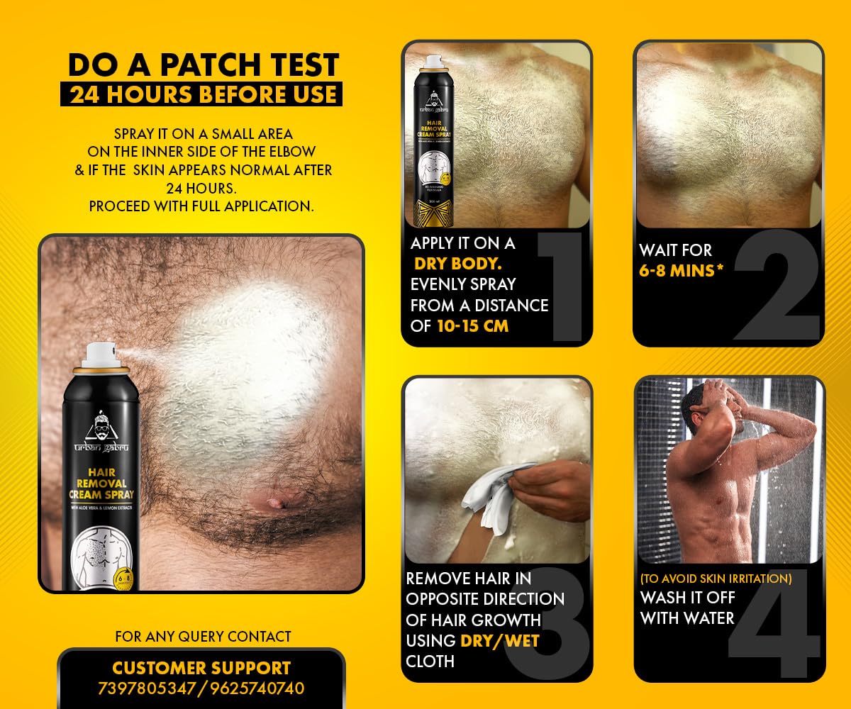 IMPORTANT TIP: Before using on the complete body or any body part, a patch test is essential. Spray the hair remover spray on a small area and see if it suits your skin. Spray away from the facial area.