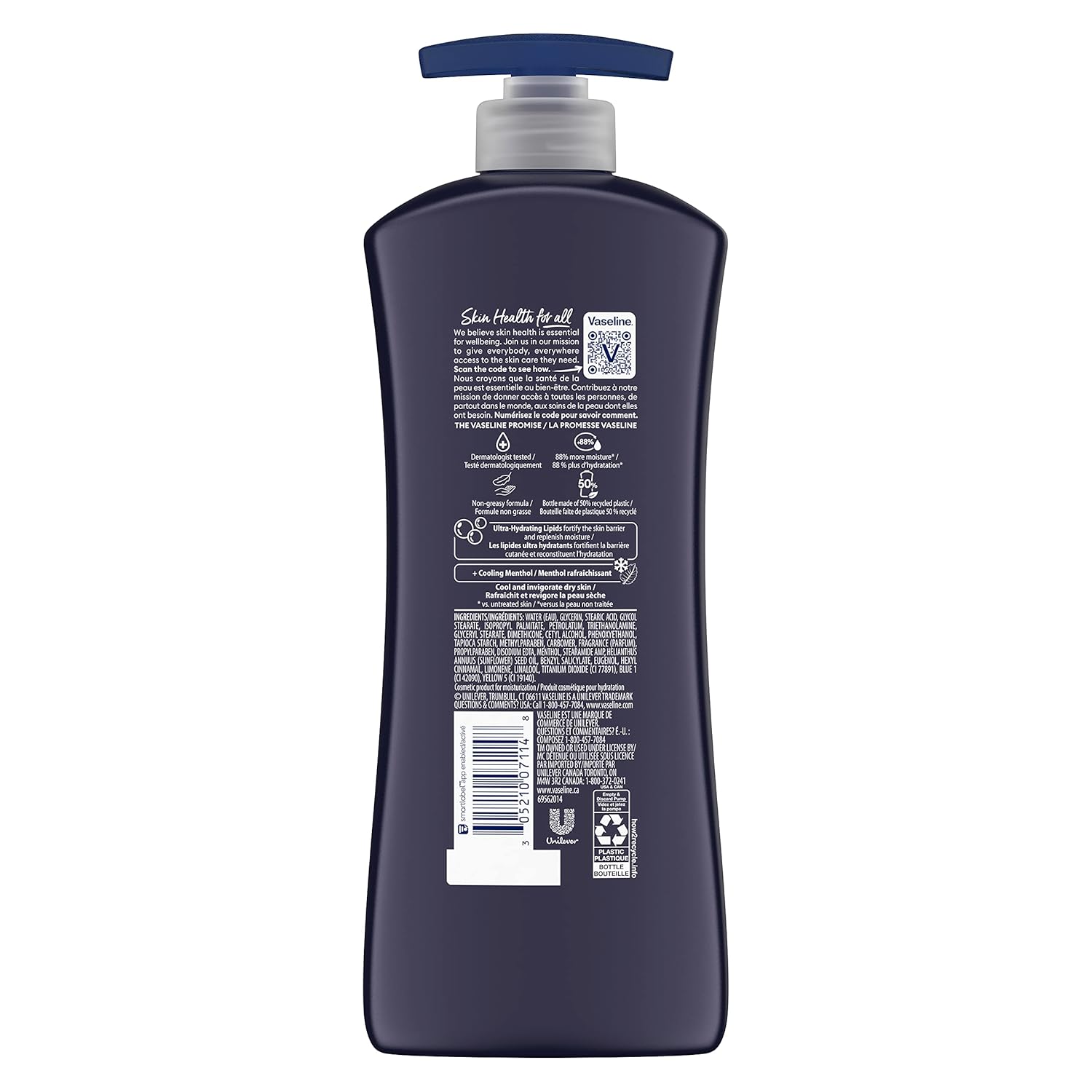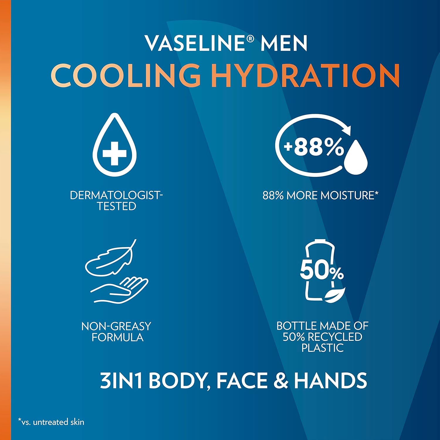 Vaseline Men Cooling Hydration 3-in-1 Lotion for Face, Body and Hands, cools and restores dry skin with cooling menthol to refresh skin on contact. This body lotion for men is formulated with Cooling Menthol, and Ultra-Hydrating Lipids that fortify the skin barrier and replenish moisture. With daily exposure to environmental triggers (like wind, lack of humidity, and sun), skin’s natural moisture barrier can break down, allowing water to escape the skin. But the Ultra-Hydrating lipids in our lotion fortify the skin barrier and replenish moisture to allow the skin’s natural barrier to recover. This lotion locks in moisture and promotes smooth, naturally glowing skin. The body moisturizer is clinically tested to provide 90% more moisture (vs. untreated skin). This lotion for dry skin absorbs fast and provides 48-hour moisture. Use this dermatologist-tested body lotion daily on dry, rough skin for stronger, noticeably healthier skin. This Vaseline lotion bottle is made of 50% recycled plastic. Our ambition is to get to 100% recycled plastic in the near future. Since 2018, we’ve used 337 Metric Tons of recycled plastic across the Vaseline product portfolio in North America. Vaseline Men range works to heal dry skin from deep within.