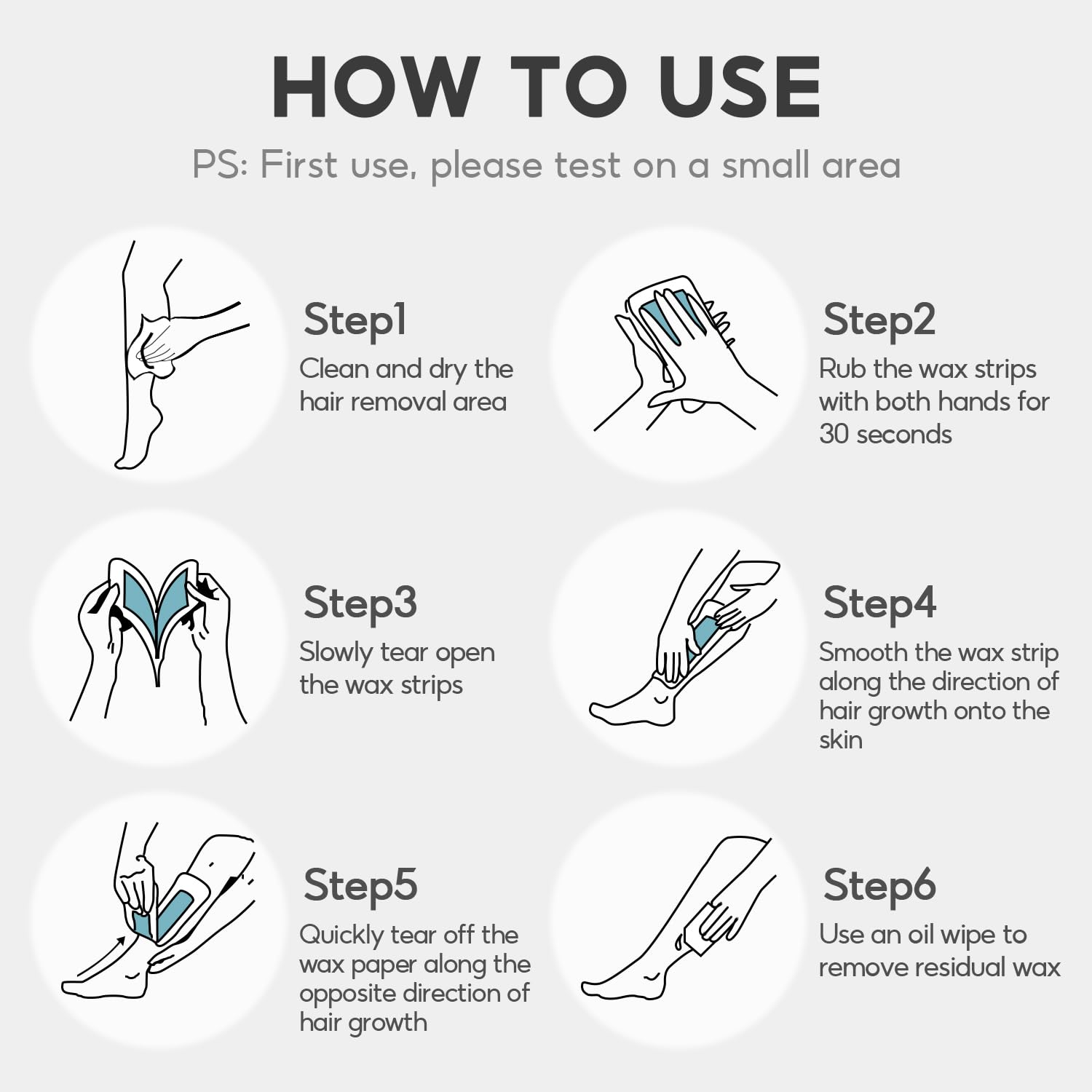 Step 1: Trim hair to a length of 0.5mm-1.5mm that is most suitable for using wax strips. Step 2: Clean and dry the hair removal area. Step 3: Rub the wax strip with both hands for 30 seconds until reaching body temperature. Step 4: Slowly tear open the wax strip and divide it into 2 pieces for use. Step 5: Smooth the wax strip along the direction of hair growth onto the skin. Step 6: Quickly tear off the wax paper along the opposite direction of hair growth. Step 7: Use an oil wipe to remove residual wax from the skin.