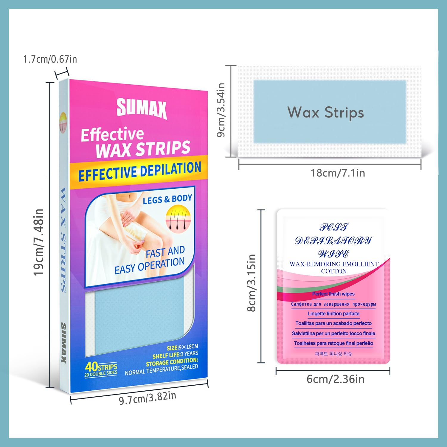 Product Name SUMAX Wax Strips Package Content Wax strips, Oil wipes Wax Strips 40 (20 double-sided) Wax Strips Size 18 x 9 cm Oil Wipes 6 Skin Type All Recommended Areas Face, Hands, Arms, Armpits, Chest, Back, Brazilian Bikini, Legs Package Dimensions 7.48 x 3.82 x 0.67 inches Package Weight 0.33 Pound Shelf Life 3 Years Storage Conditions Room temperature, sealed