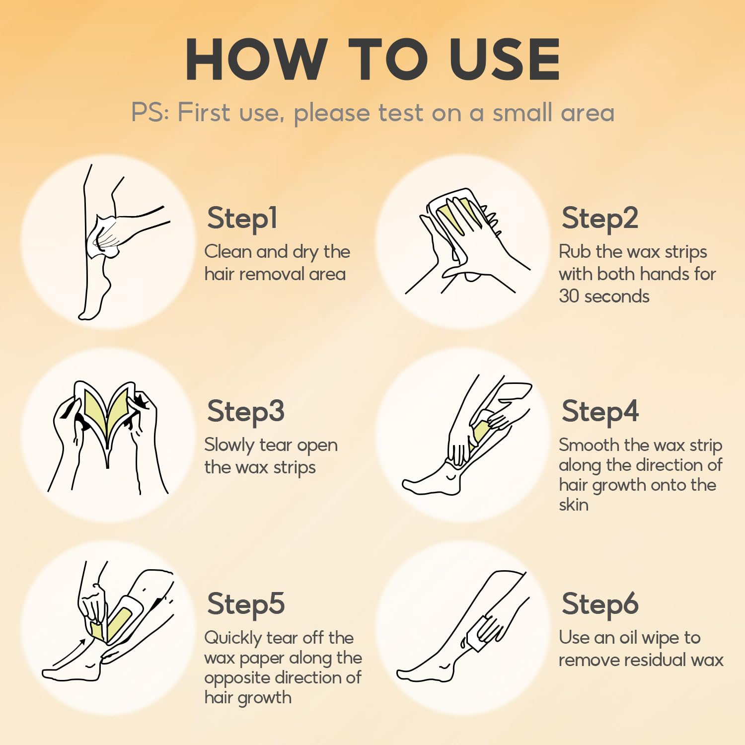 Before using a new waxing strips product, a skin test should be performed first; When tearing off the hair removal wax paper, go against the direction of body hair growth and tear it off in a quick and neat motion; It is not advisable to use perfume, soap, antiperspirant products or sunbathe within one day after hair removal; Do not use on skin with varicose veins, ulcers, damage, sunburn or other wounds; Use with caution on highly allergic skin types.