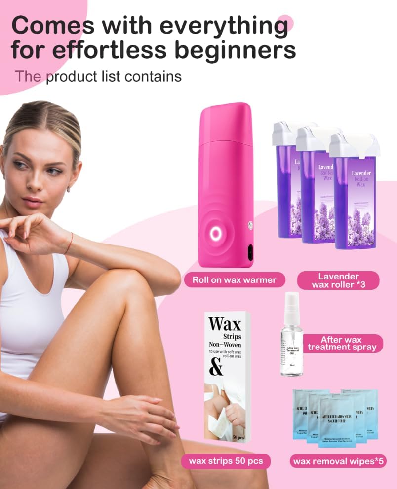 🏠 All-In-One Waxing Solution for Home Use: Our complete kit is a perfect home waxing kit for women, featuring automatic and precise temperature control to prevent skin from burning, suitable even for sensitive skin. It includes 1 smart wax warmer, 2 lavender wax roller refills, 1 After wax treatment spray, and 50 Non woven waxing strips. This kit can effectively remove hair in large quantities, making it an ideal choice for beginners in hair removal, especially for larger body areas.