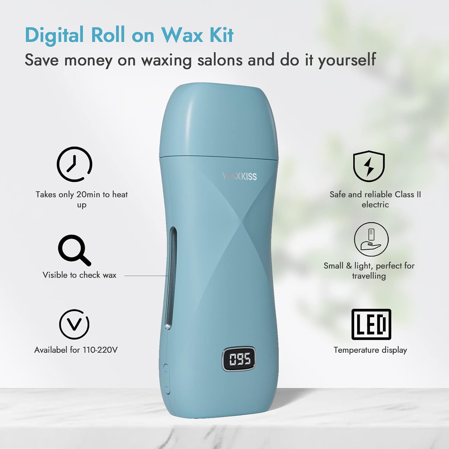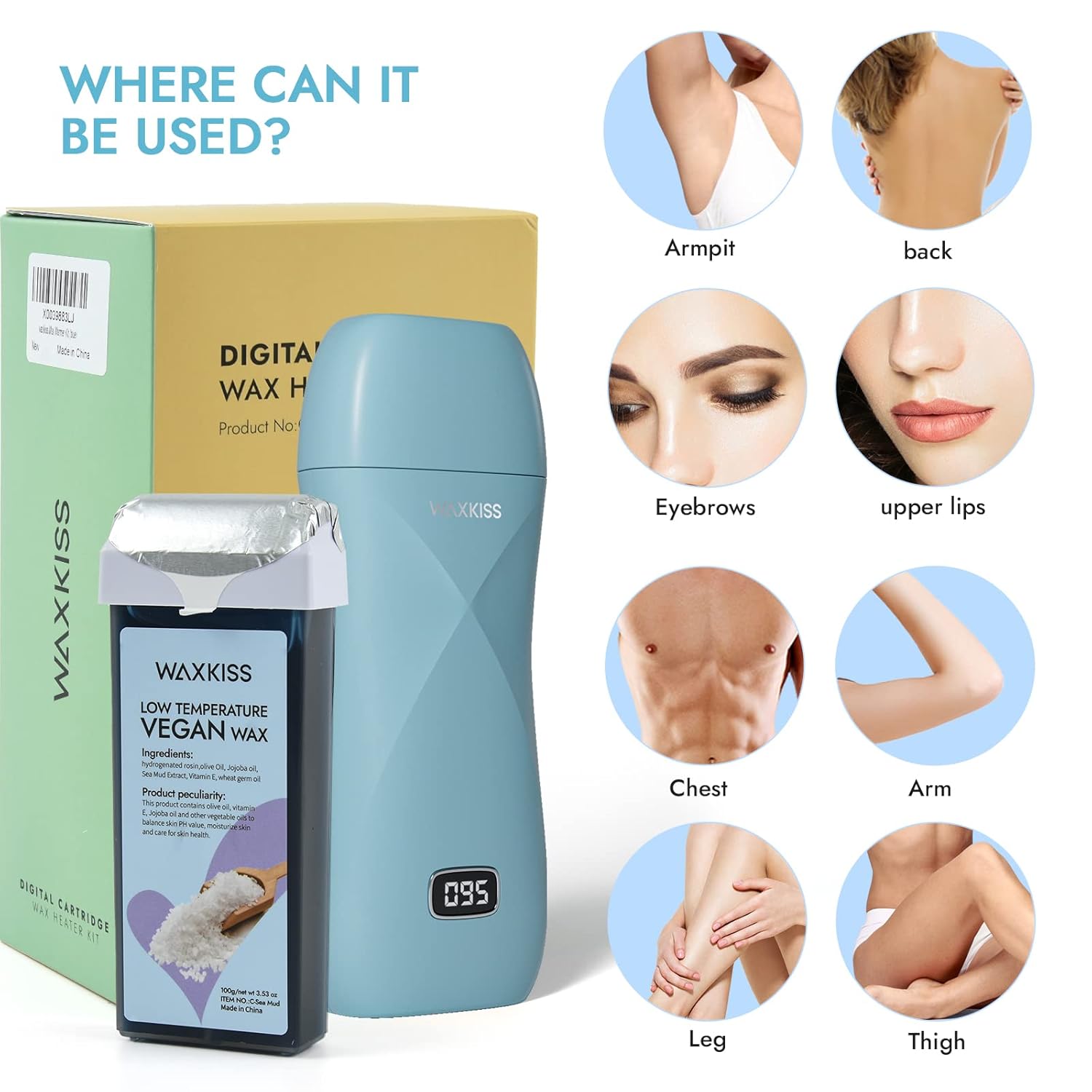 Waxkiss Roll On Wax Kit, Waxkiss Wax Roller Digital For Hair Removal, Soft Waxing Kit for Sensitive Skin, Wax Heater with 2 cartridges, 12 Wipes, 1 Pair Gloves and 100pcs Wax Strips