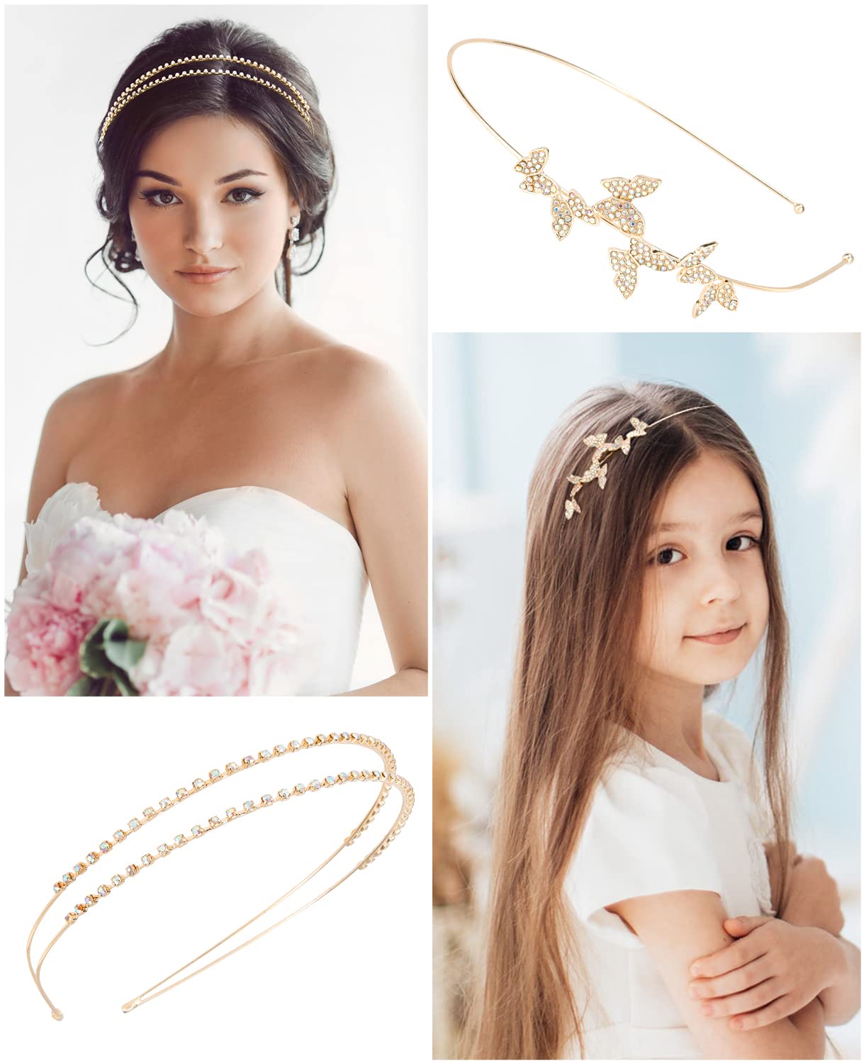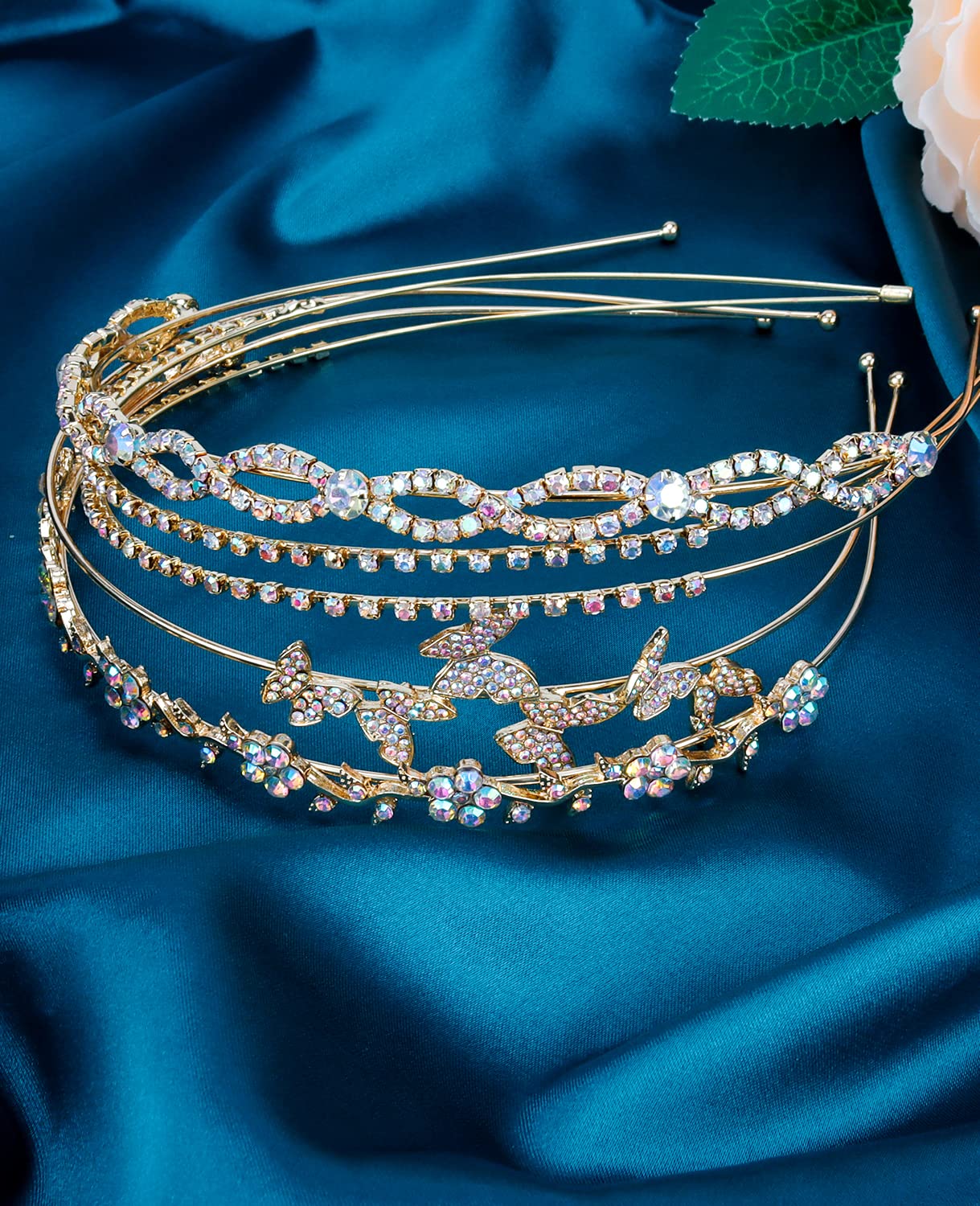 Wecoe 4 Pack AB Rhinestone Headbands Gold Metal Headbands Flower Girl Bridal Wedding Headband Crystal Headpieces Flower Leaf Butterfly Headband Formal Hair Accessories For Women Girls Gifts