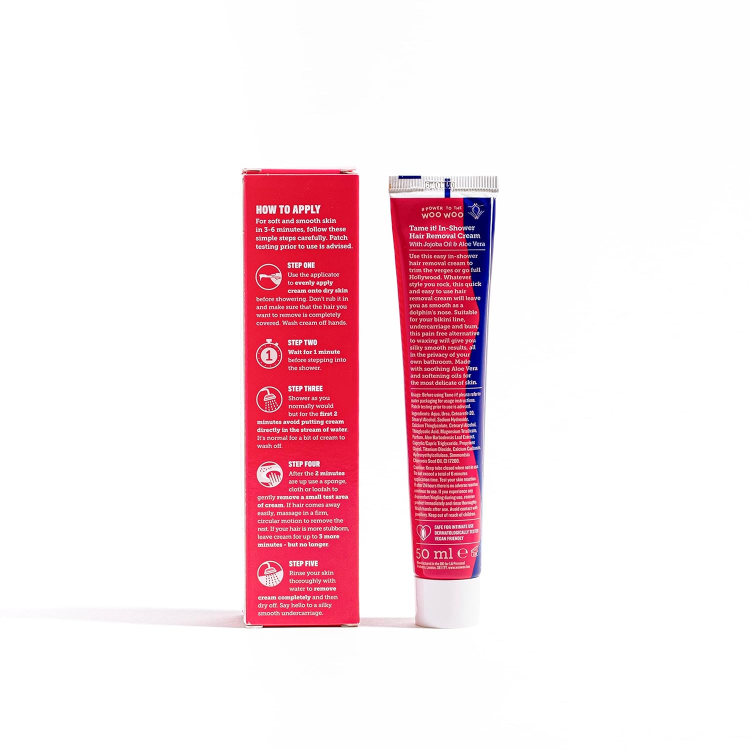 WooWoo – Tame It! In-Shower Natural Hair Removal Depilatory Cream | No Irritation Vegan Hair Remover For Sensitive Skin – Legs, Bikini, Intimate Areas (1.7 oz | 50 ml)