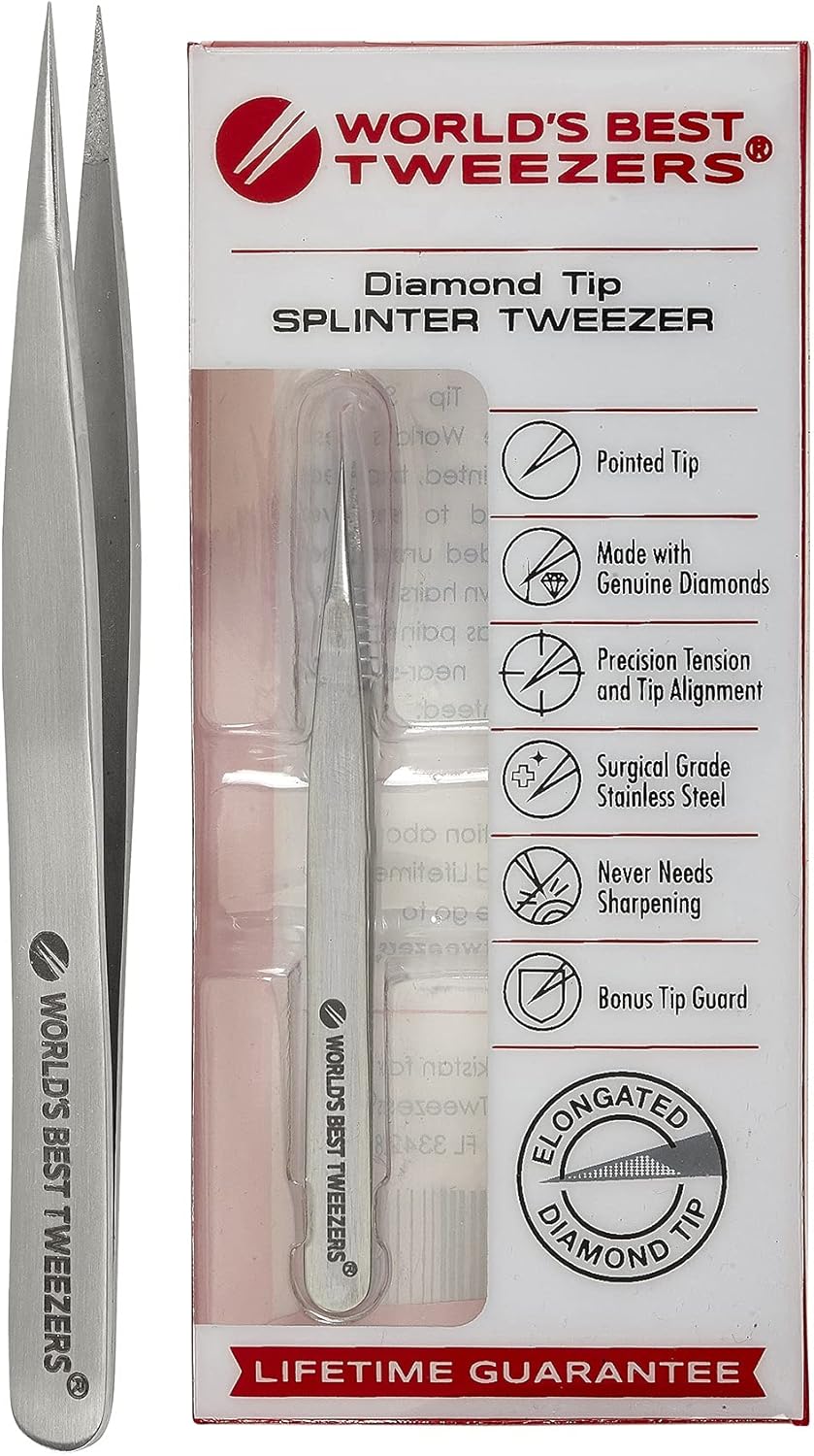 World’s Best Tweezers Diamond Tip Splinter Tweezers – Diamond Coated, Professional Precision Needle Nose Pointed Tweezer for Ingrown Hair, Splinter, Ticks, and Glass Removal – Stainless Steel