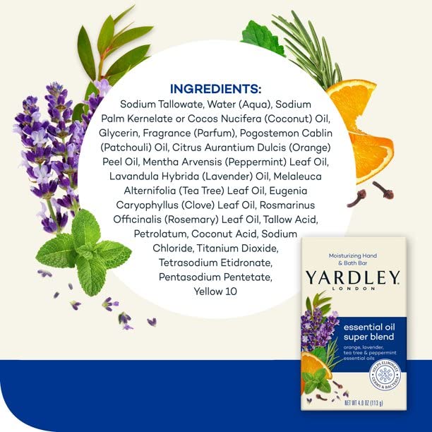 Yardley London Essential Oil Super Blend Soap (orange, lavender, tea tree, peppermint oils), 3-Bars, 3 x 4 oz,